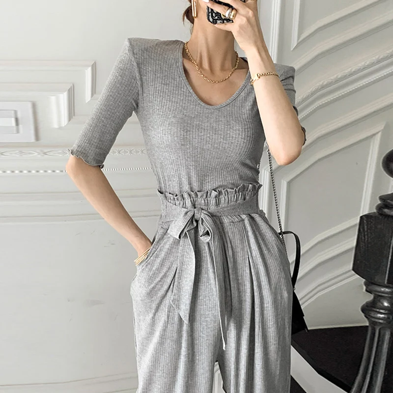 Korean Chic O Neck Skinny Short Sleeve Women T-shirt + High-waist Lace-up Wide-leg Pants Trousers Women Casual Two Piece Sets