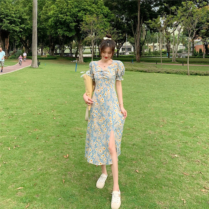 Little Daisy Floral Dress Women 2021 Summer French Gentle Temperament Sundress Female Thin Waist Platycodon Long Vestidos Ladies
