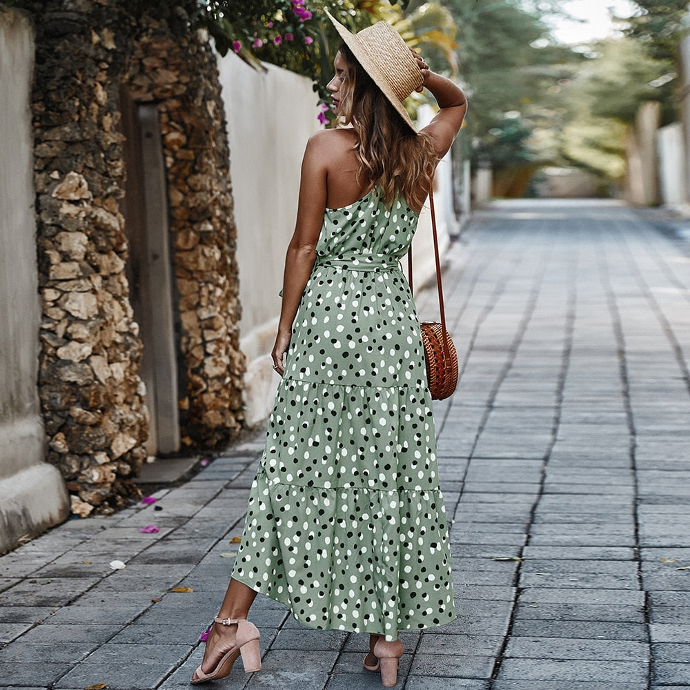 Long Dot Vacation Style Print Dress Women Lace Up High Waist O Neck Big Swing Dress New 2021 Fashion Summer Sleeveless Dress