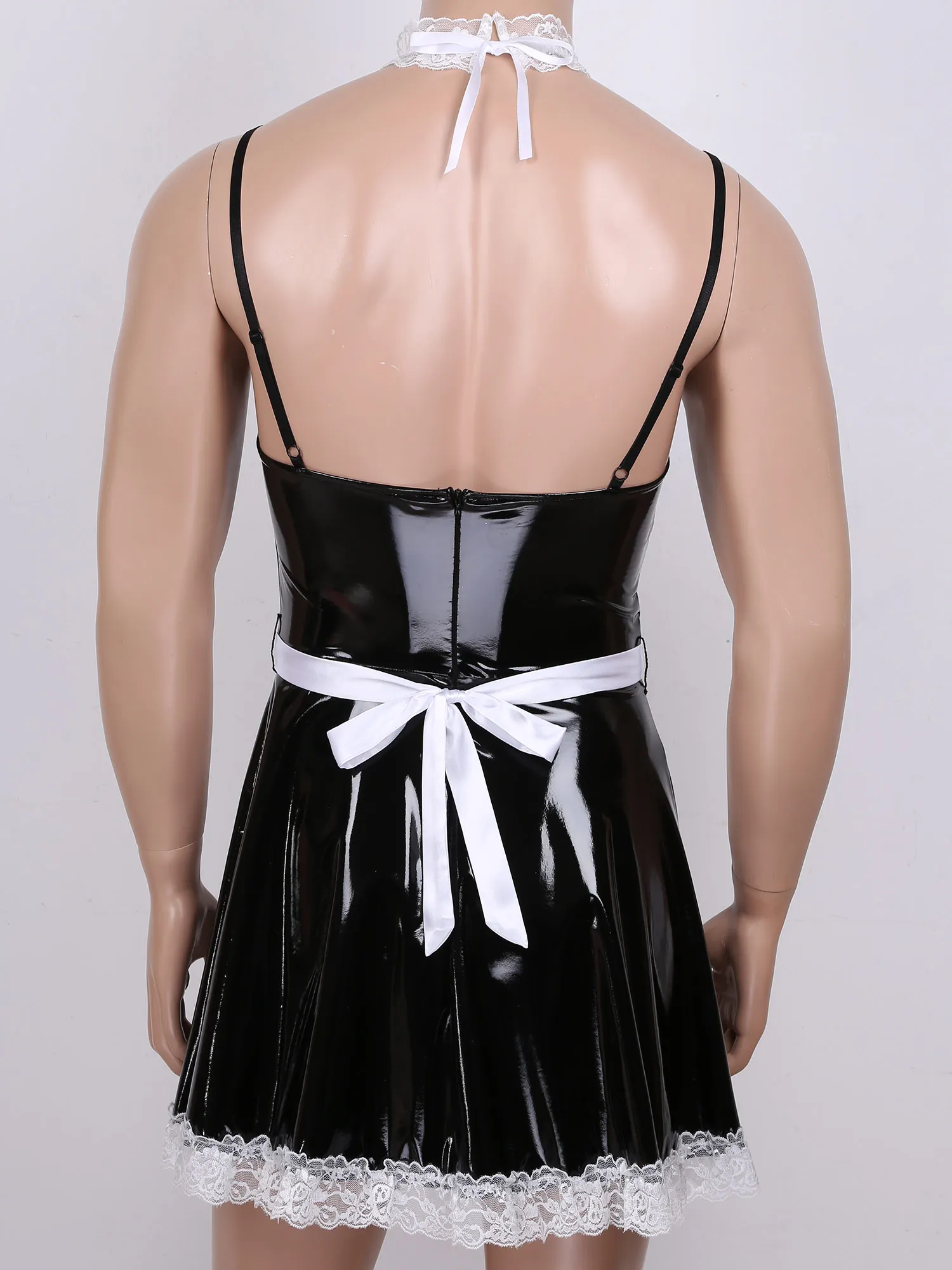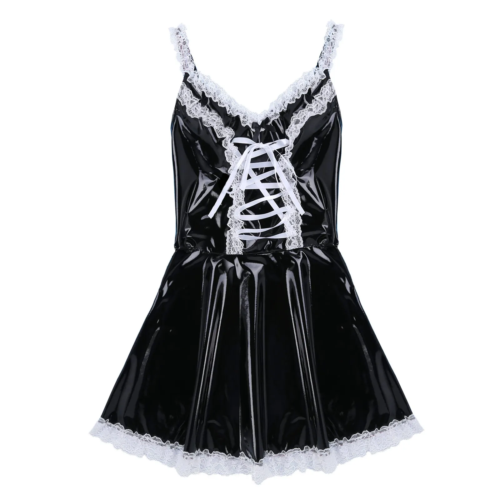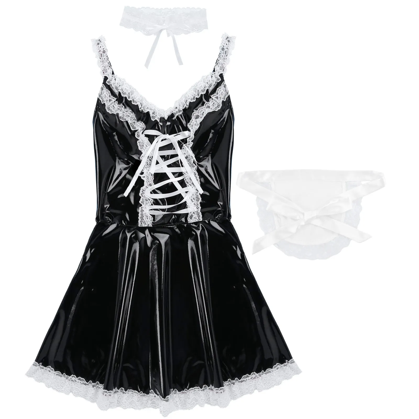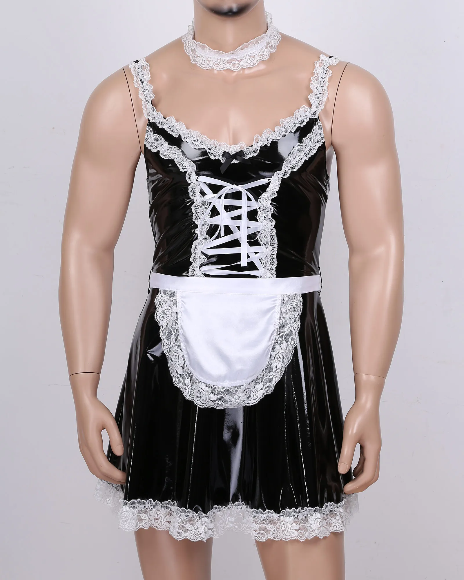 Mens Sissy Patent Leather Maid Dress Cosplay Costume Lingerie.