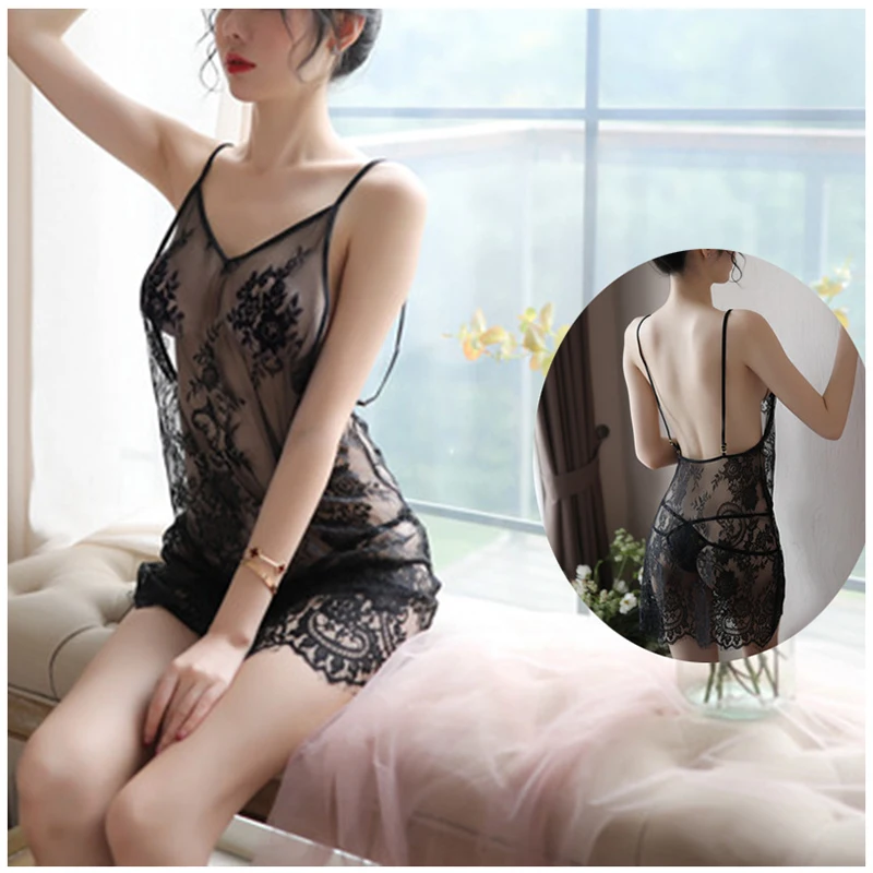 Sexy Deep V Thin Open Back Transparent erotic Lingerie Large Size Sling Lace Eyelash Nightdress