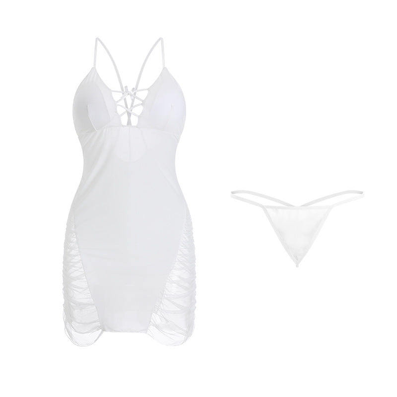 New Nightgowns Women's Sexy Lingerie Deep V Hollow Out Pleats Suspender Nightdress Femme Satin Mesh Erotic Hot Nightwear