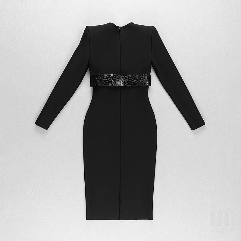New Winter Black Elegant Bandage Midi Dress Women Long Sleeve Heart Collar Leather Sashes Wedding Club Cocktail Party Lady Dress