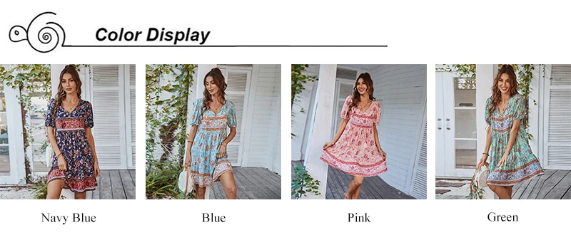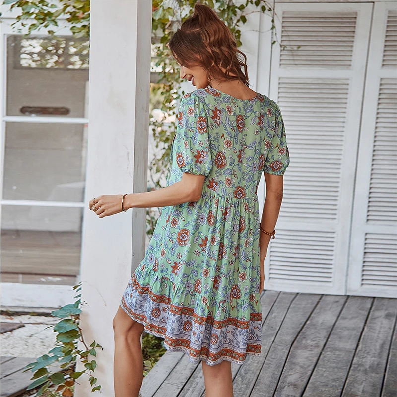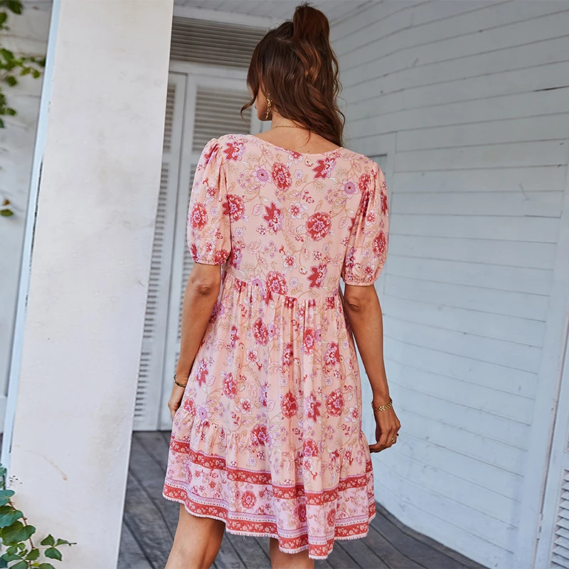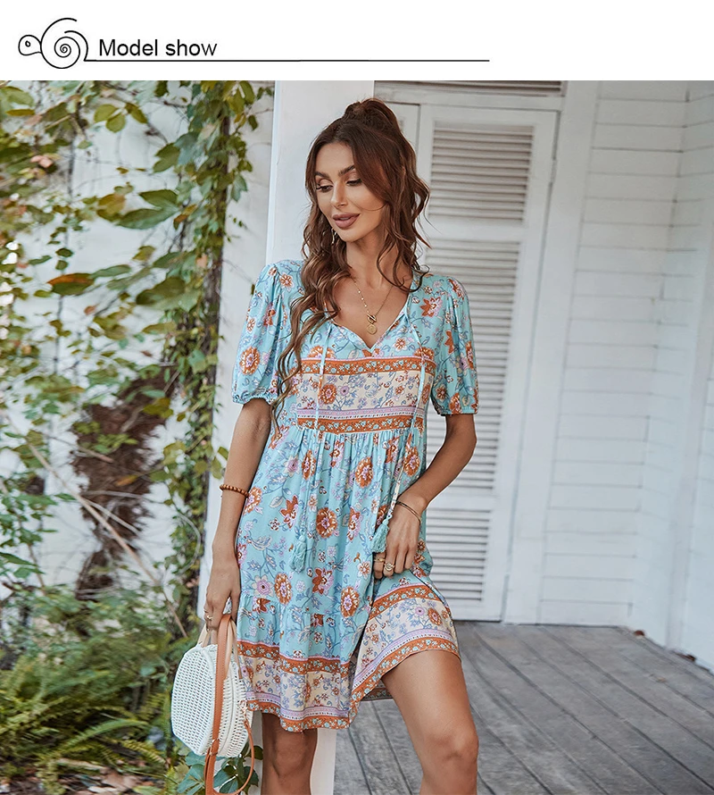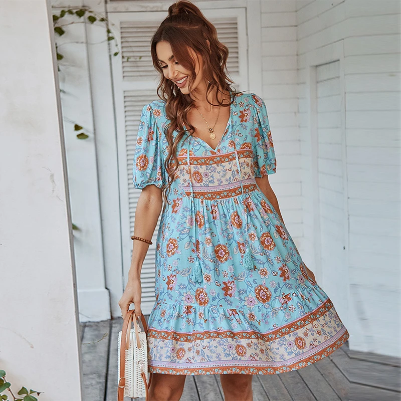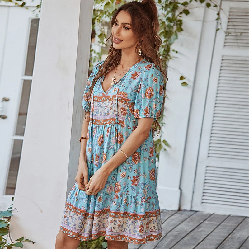 New Women's Casual Floral Print V Neck Dress Spring Summer Short Sleeve Loose Lace Up Pullover High Waist Female Mini Vestidos