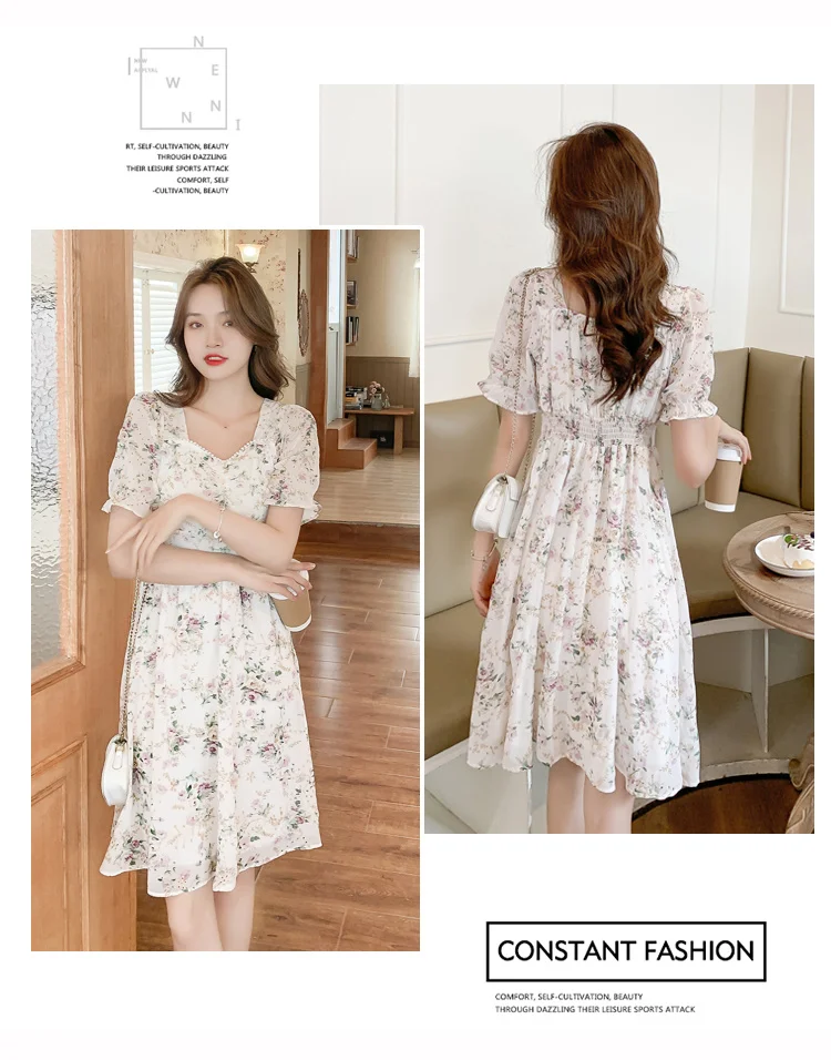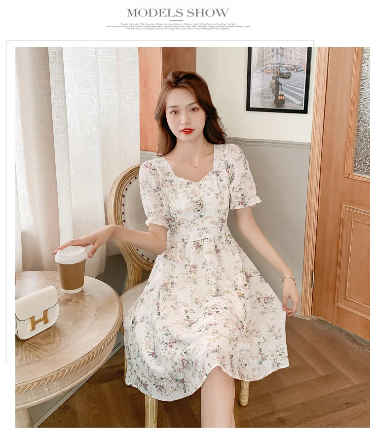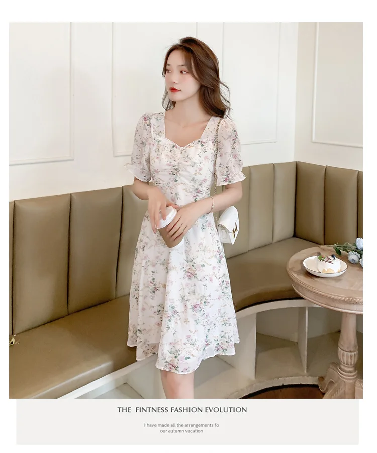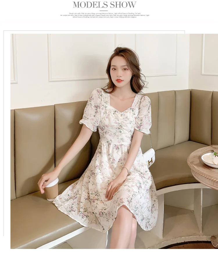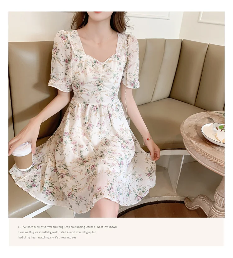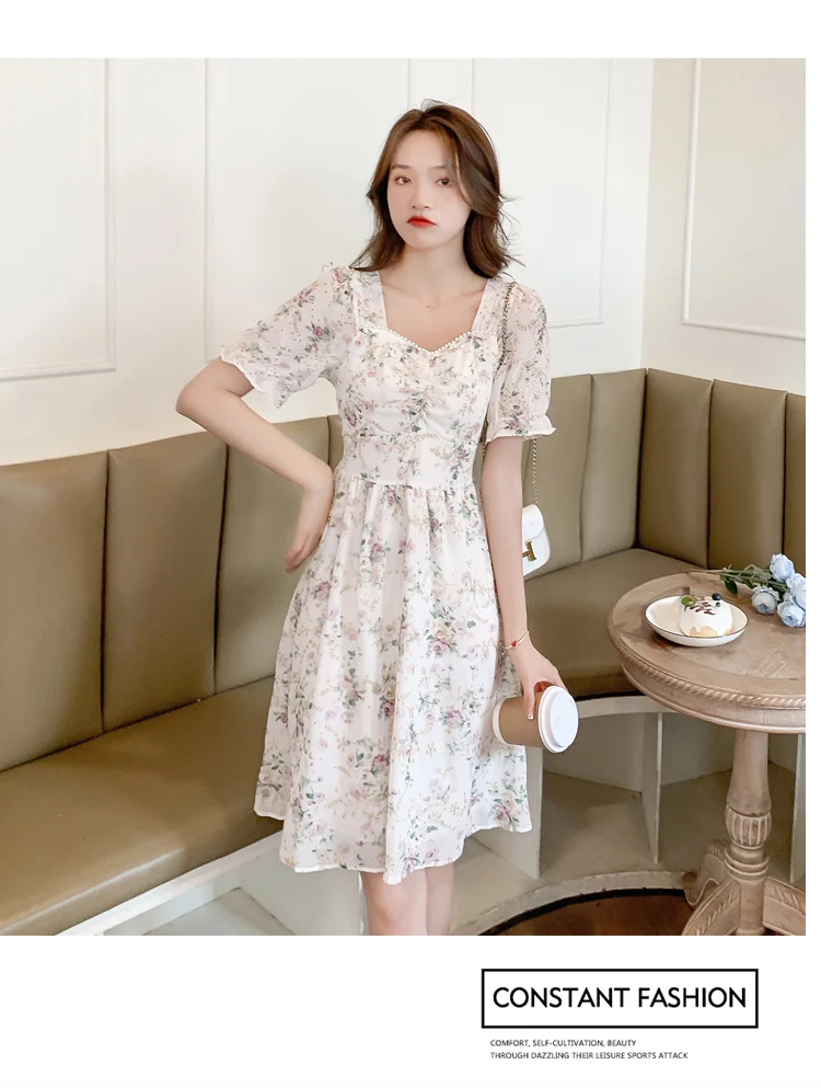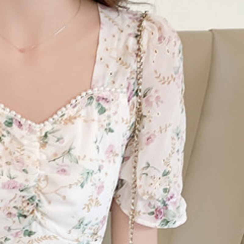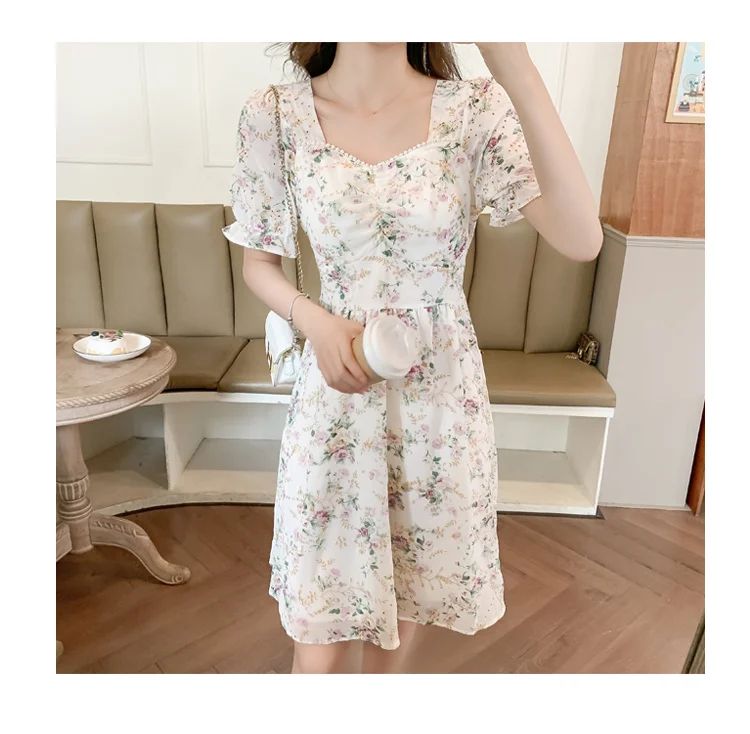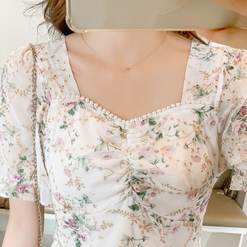 New Women Fashion Short Sleeve Beading Square Collar Slim Floral Dress Summer Ladies Casual Sweet Embroidered Chiffon Fairy Robe
