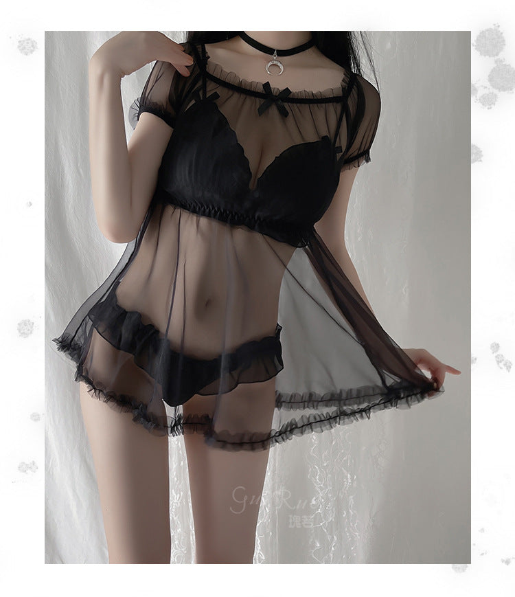 New women gauze perspective bow shoulder sexy three hot temptation set of three exotic Nightdress bras panties see through cute