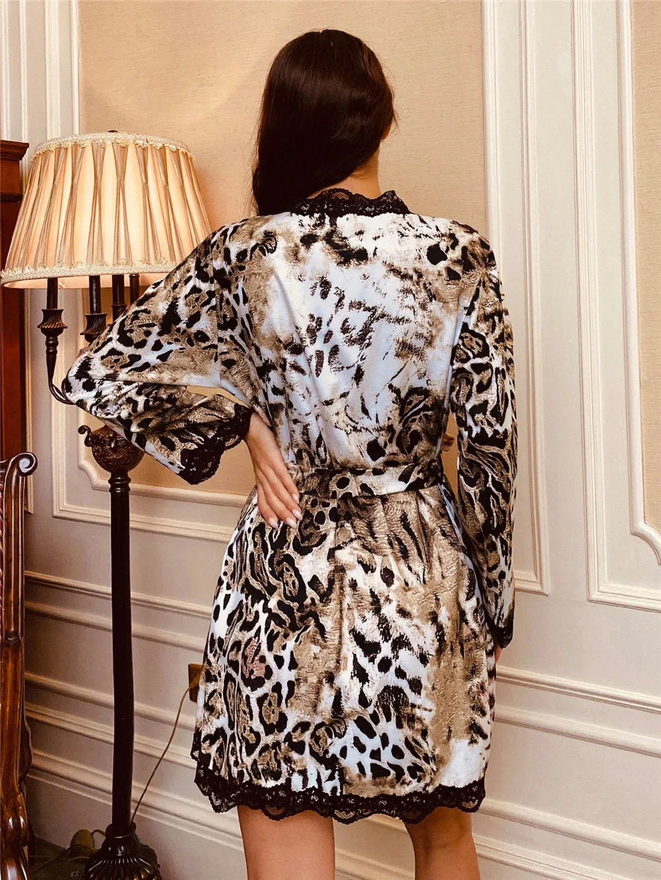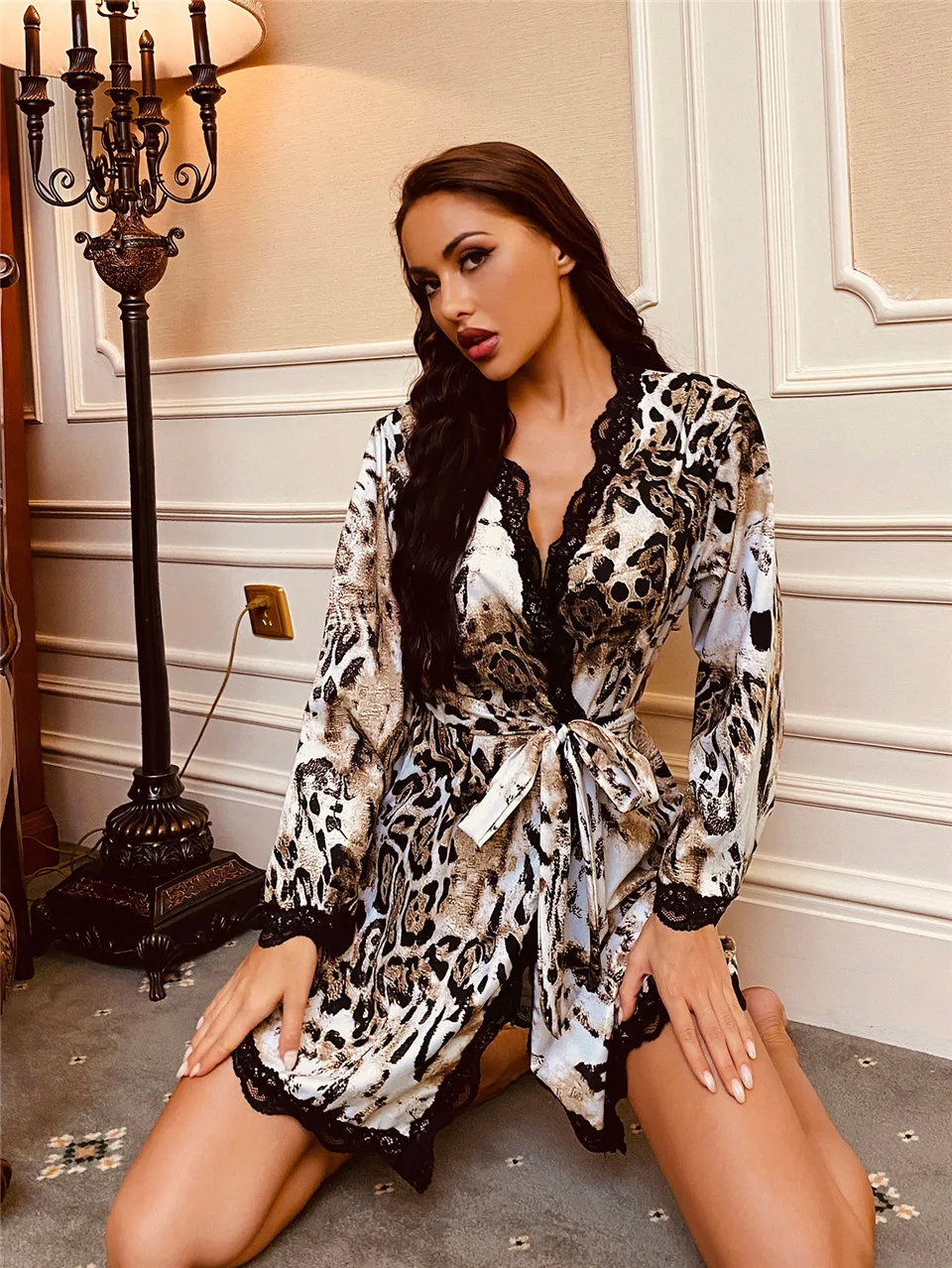 Sexy Bathrobe Allover Print Lace Trimed Belted Night Robe Leopard Nightwear Cozy Bridesmaid Robe Wedding Party Nightdress