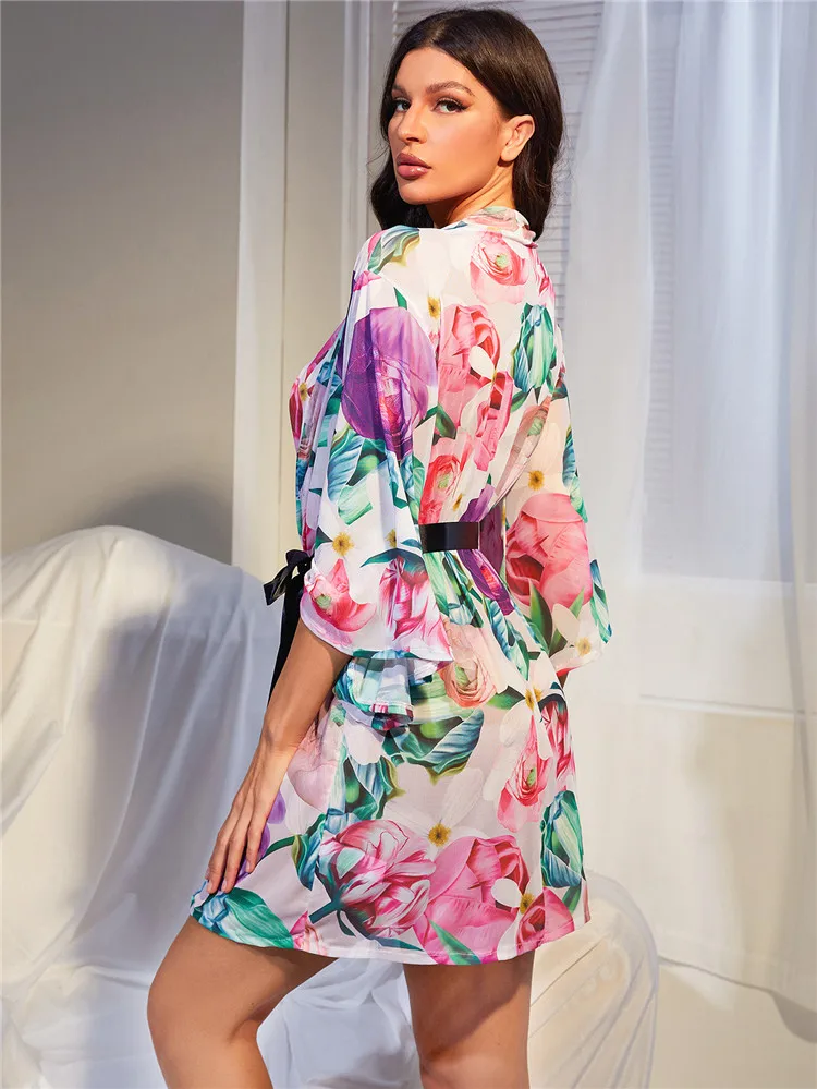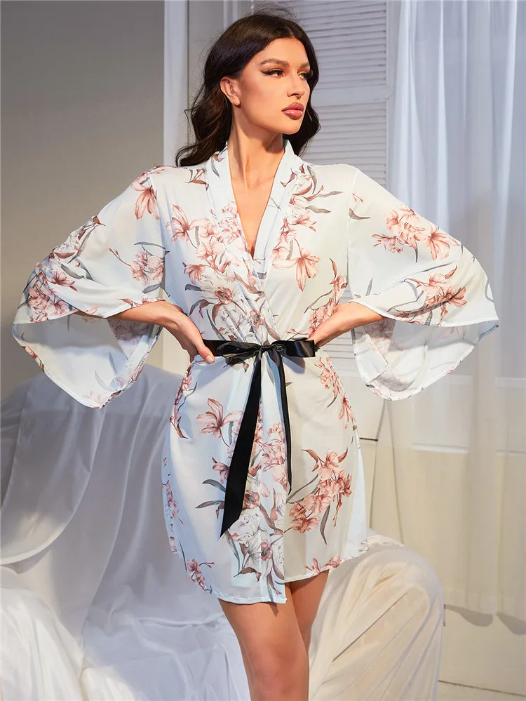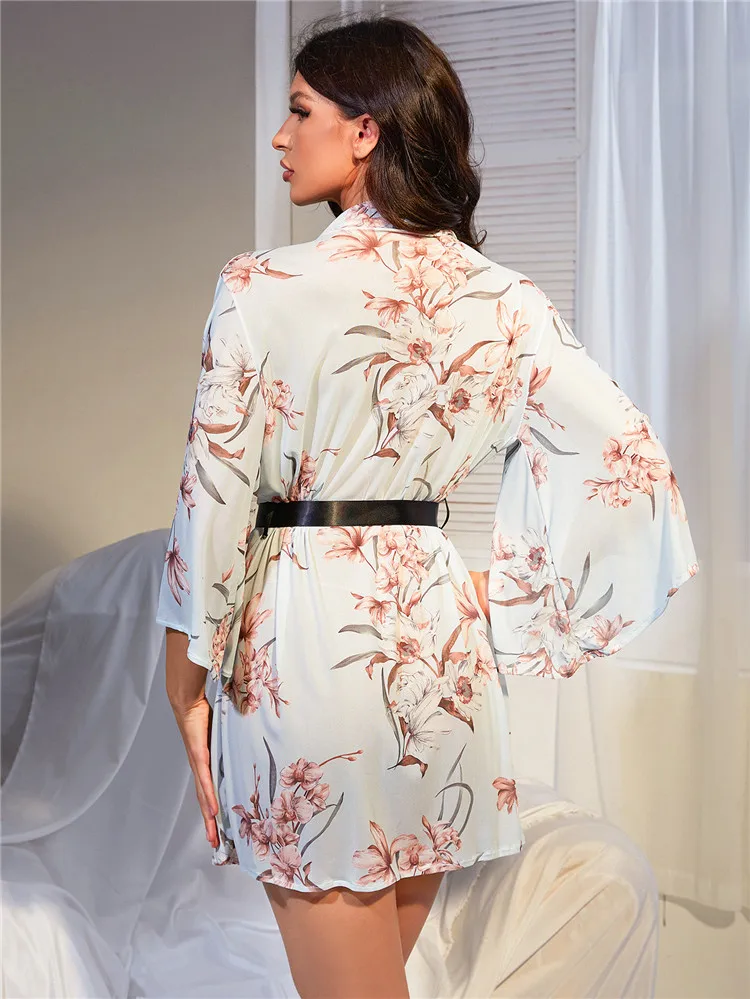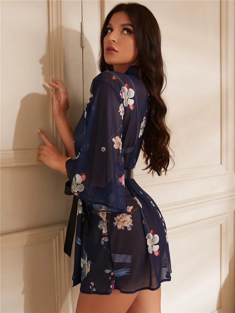 Sexy Bathrobe Froal Print Belted Night Robe Mesh Nightwear Cozy Bridesmaid Robe Wedding Party Nightdress