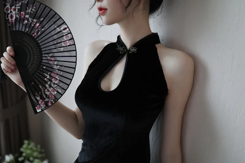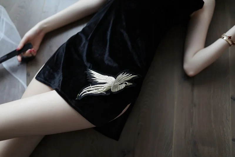 Sexy Cheongsam Ladies Gowns Black Embroidery Lingerie Sleep Wear Nightgown Womens Clothing Lingerie Dress Hot Erotic Nighty