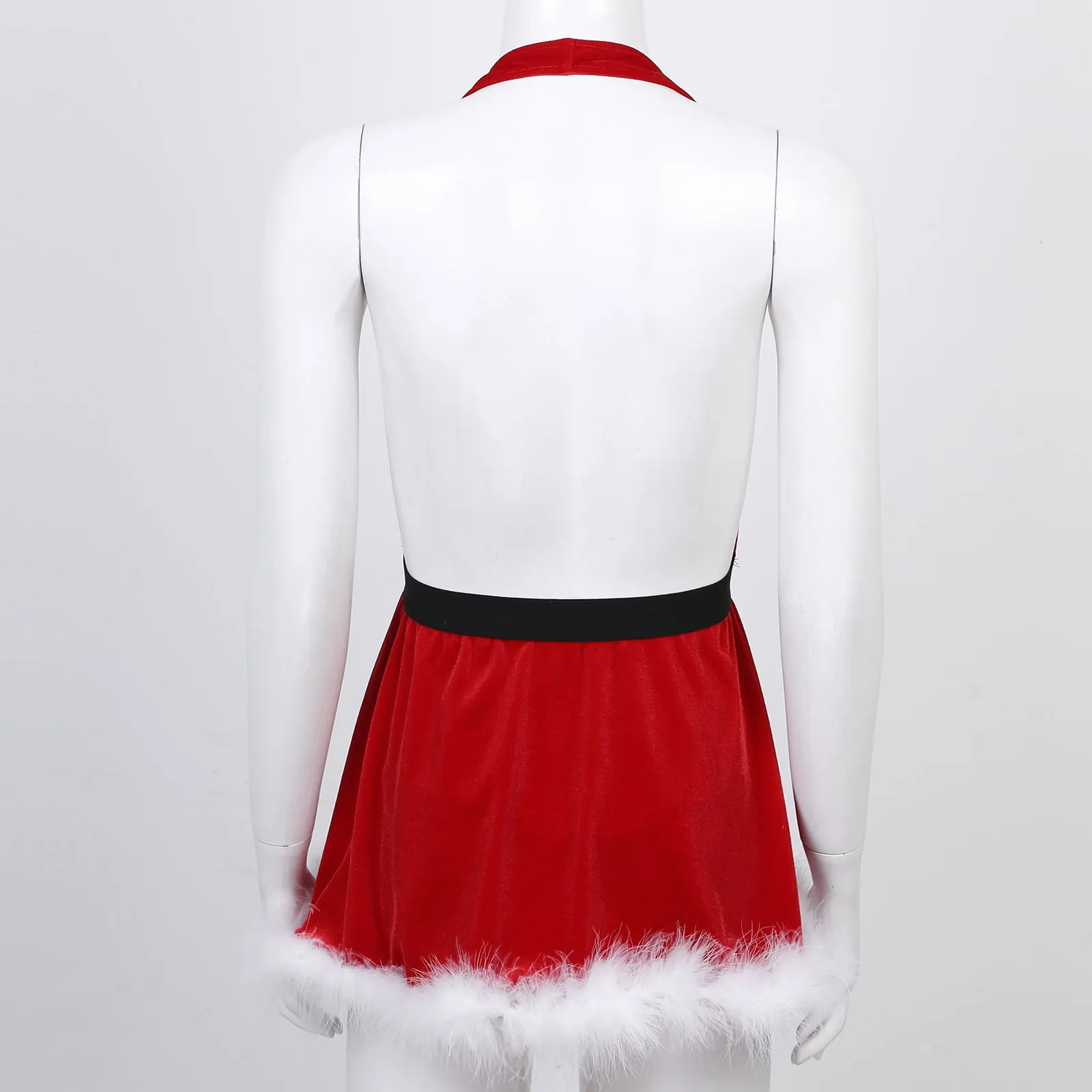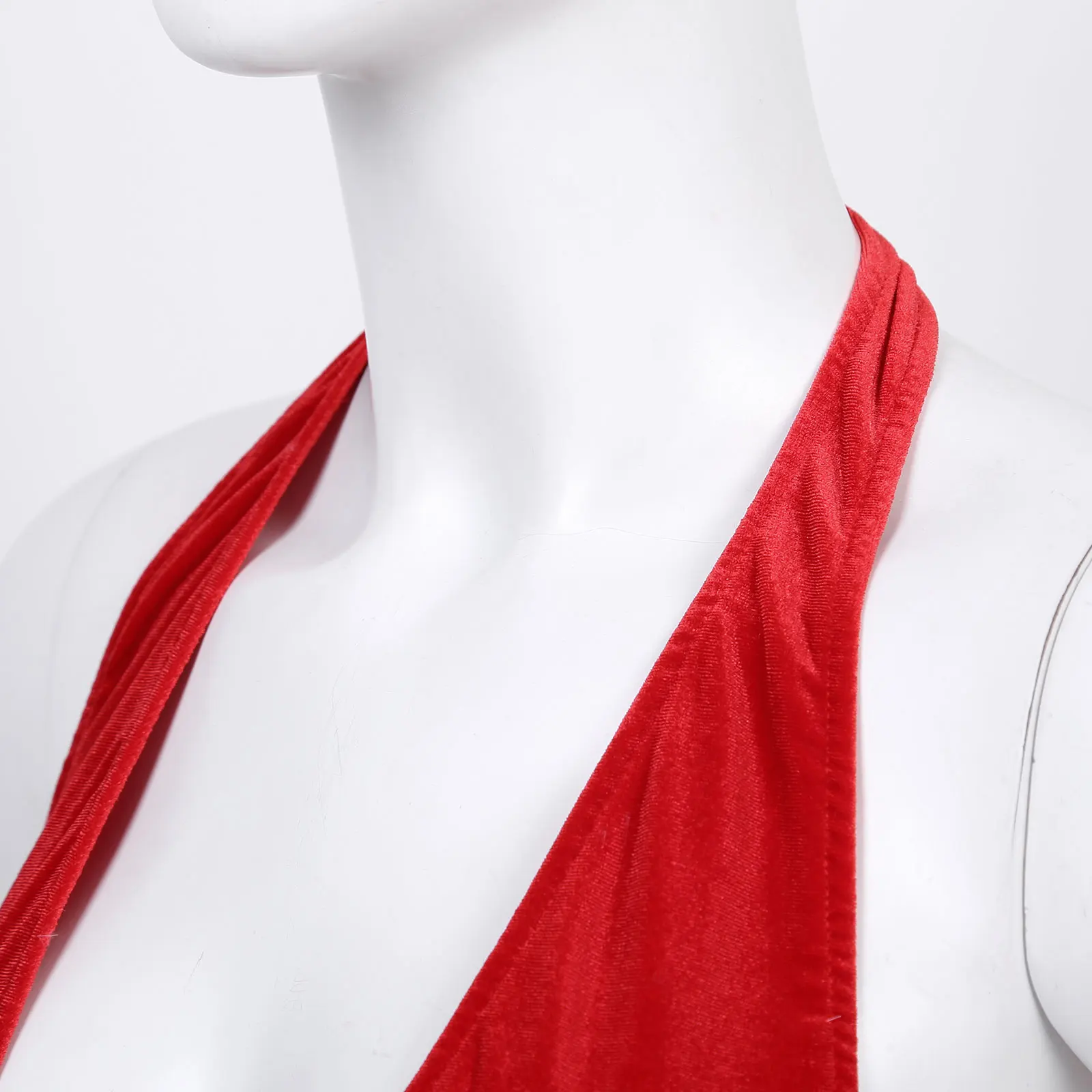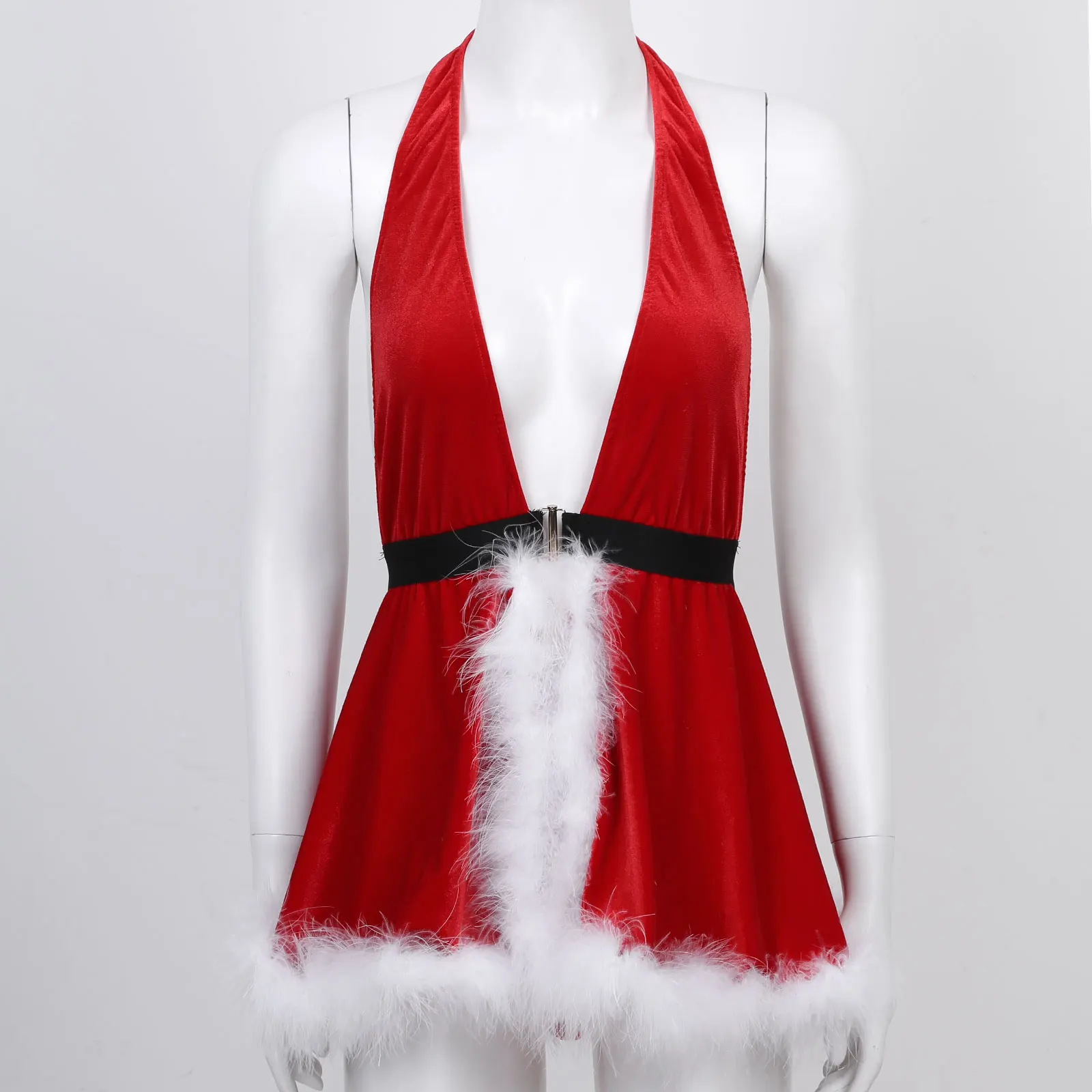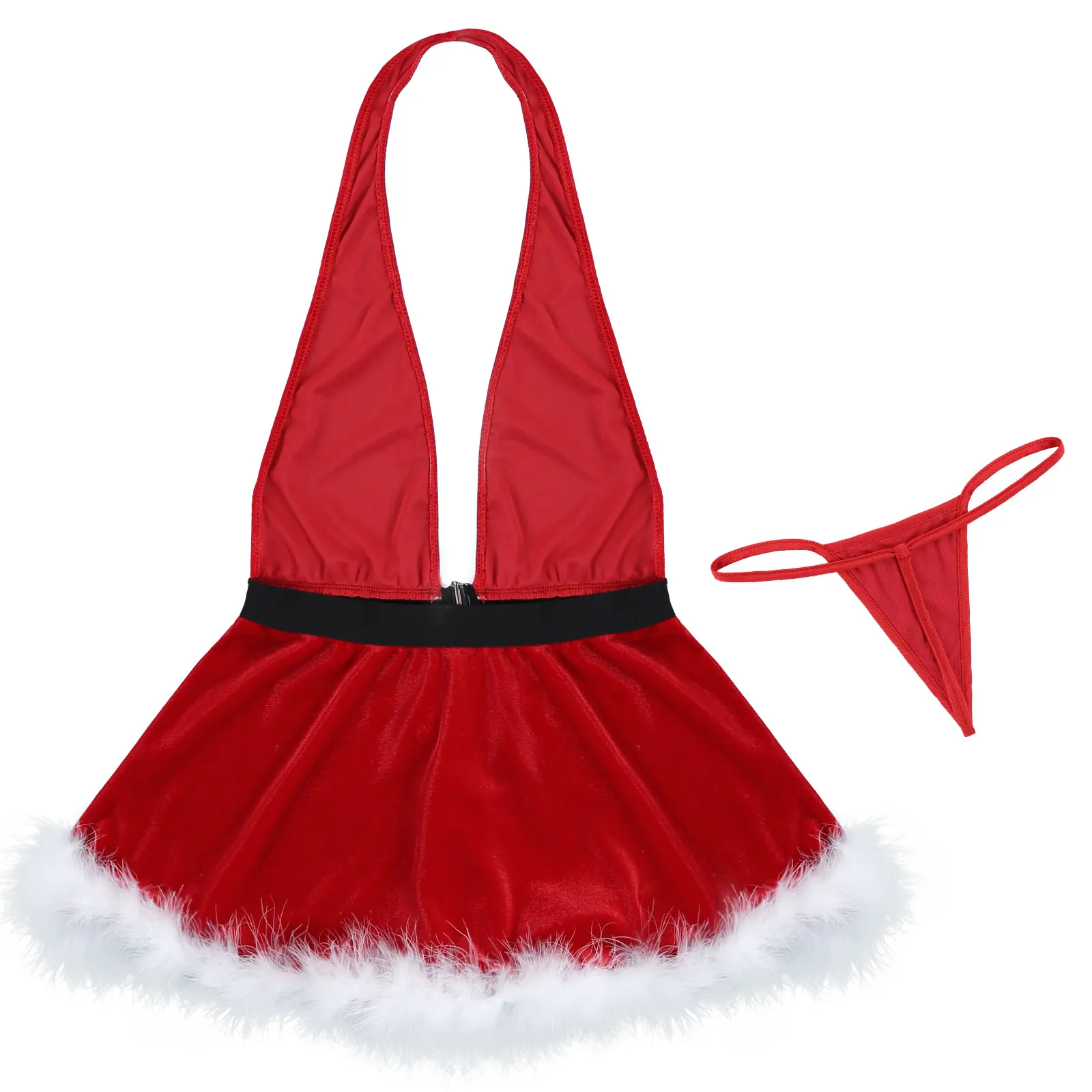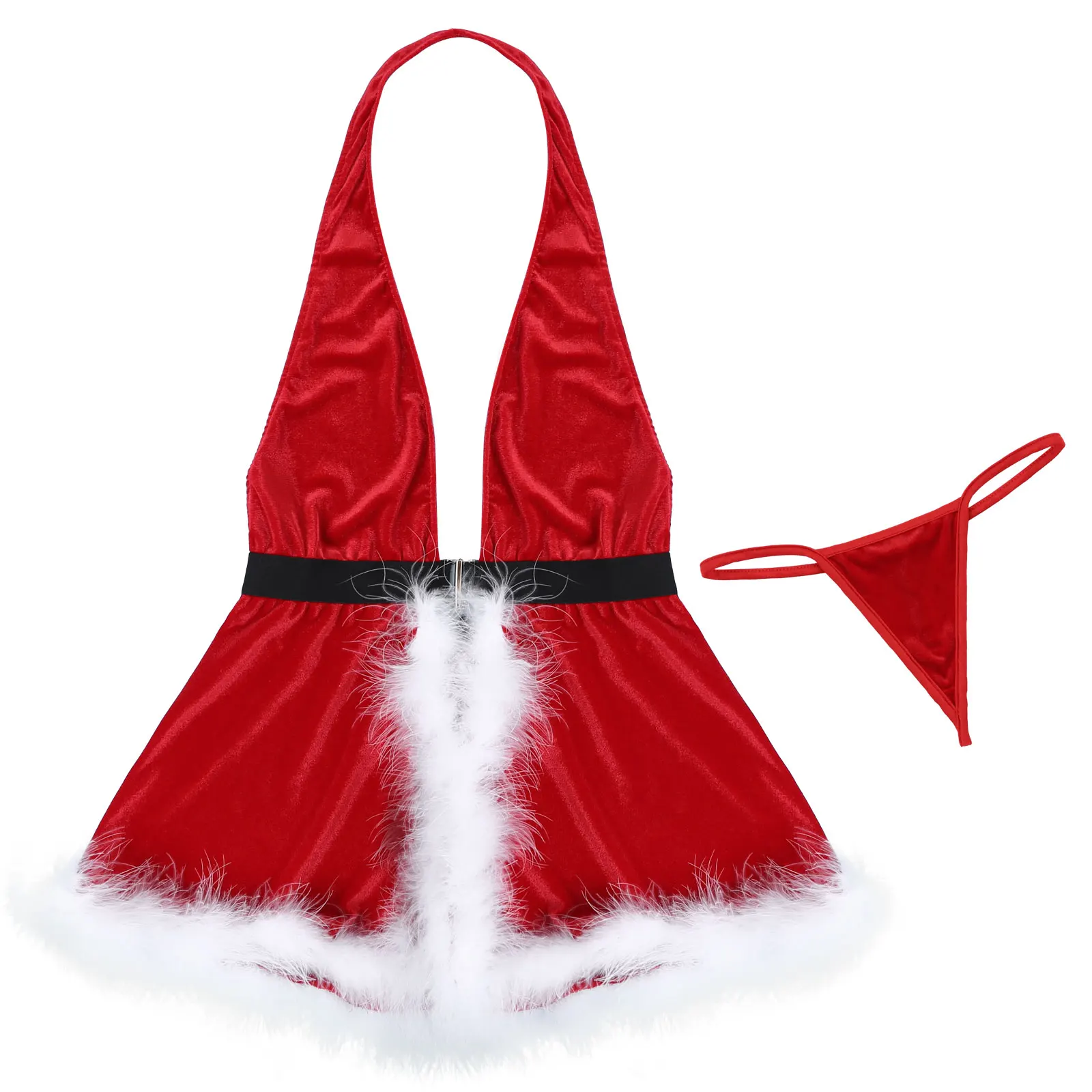 Sexy Christmas Lingerie Costumes Womens Velvet Christmas Halter Deep V Neck Backless Plunge Babydoll Split Dress with G-string