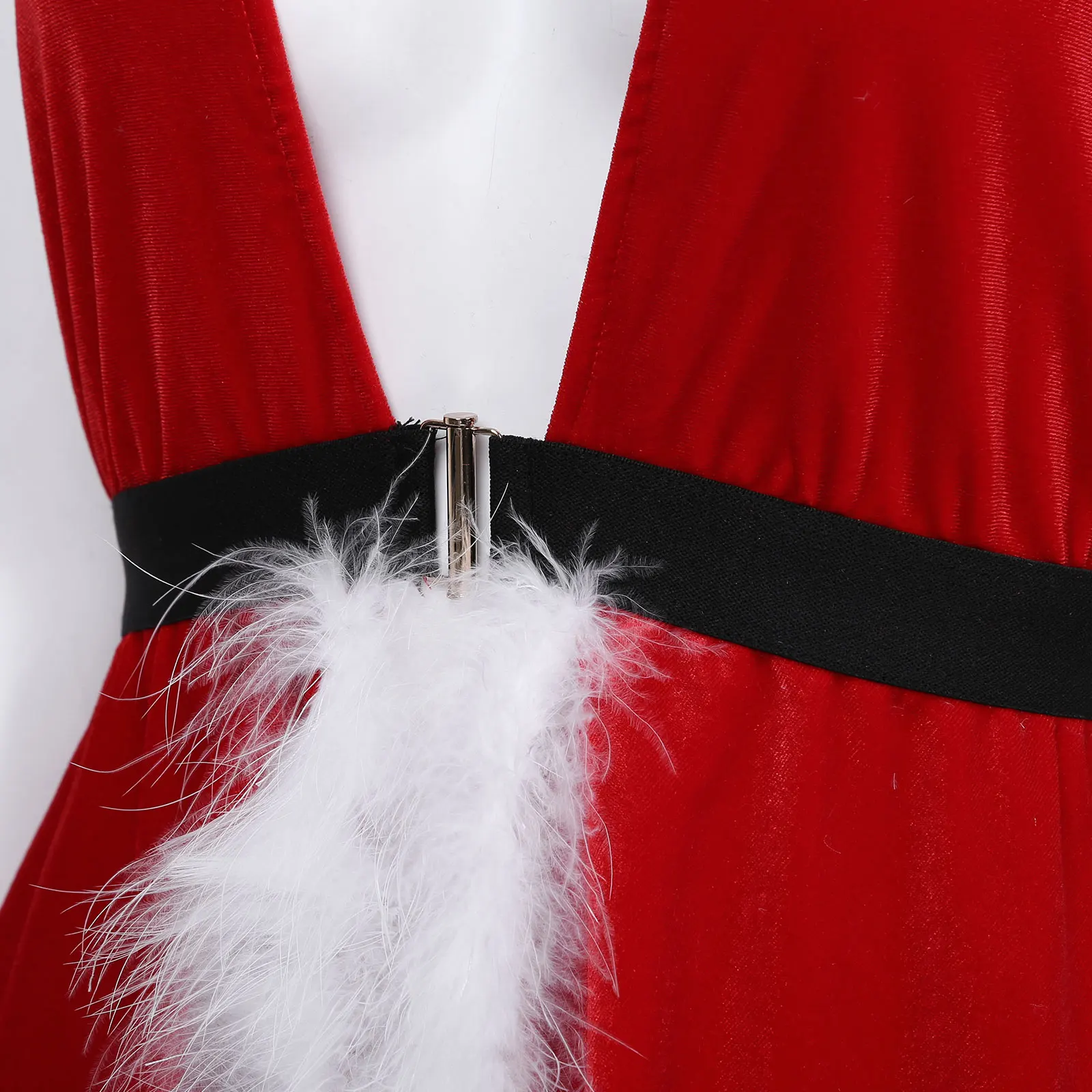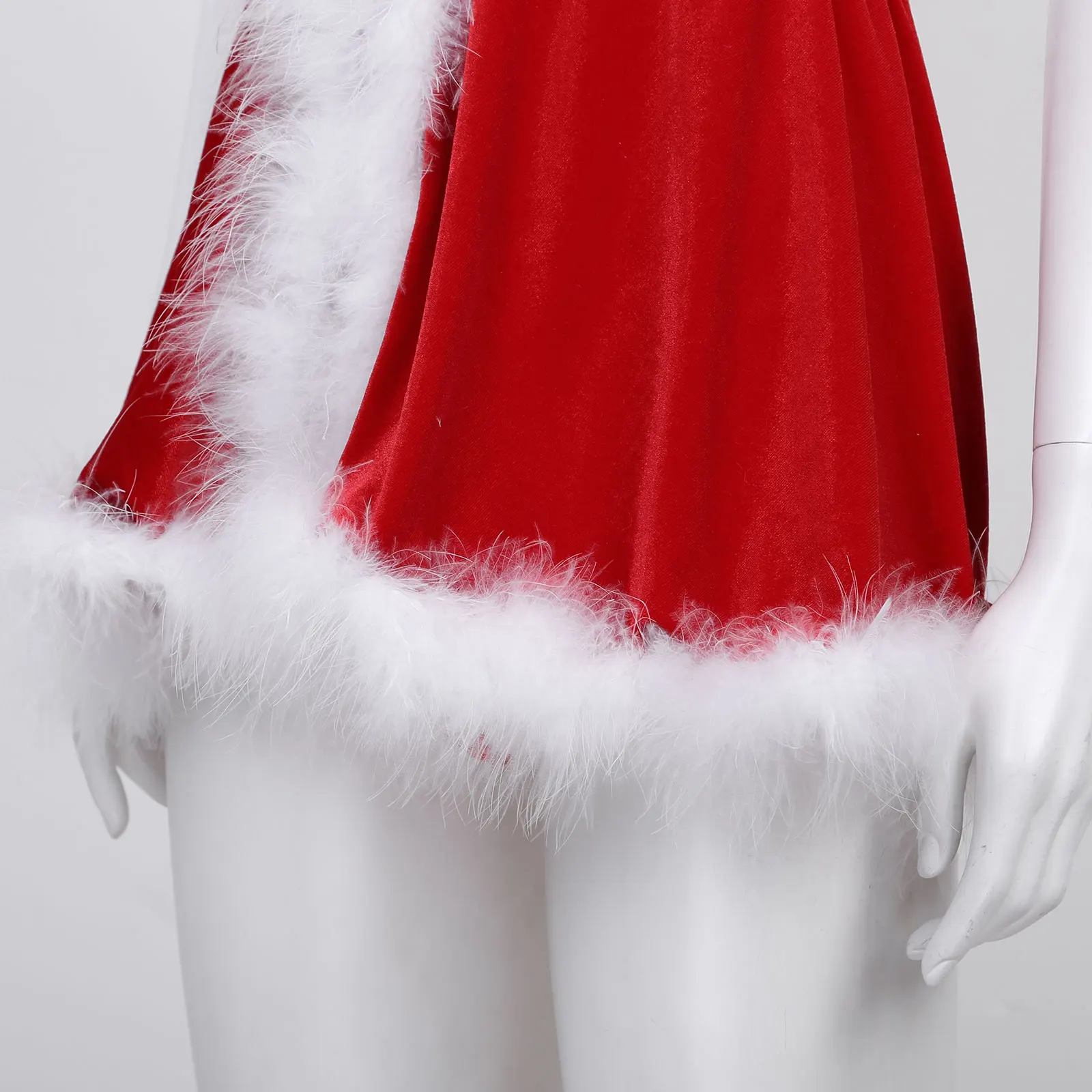 #S-XL Women Velvet Halter Deep V Neck Backless Dress Front Split Feather Trimming Lingerie Christmas Costumes with G-string
