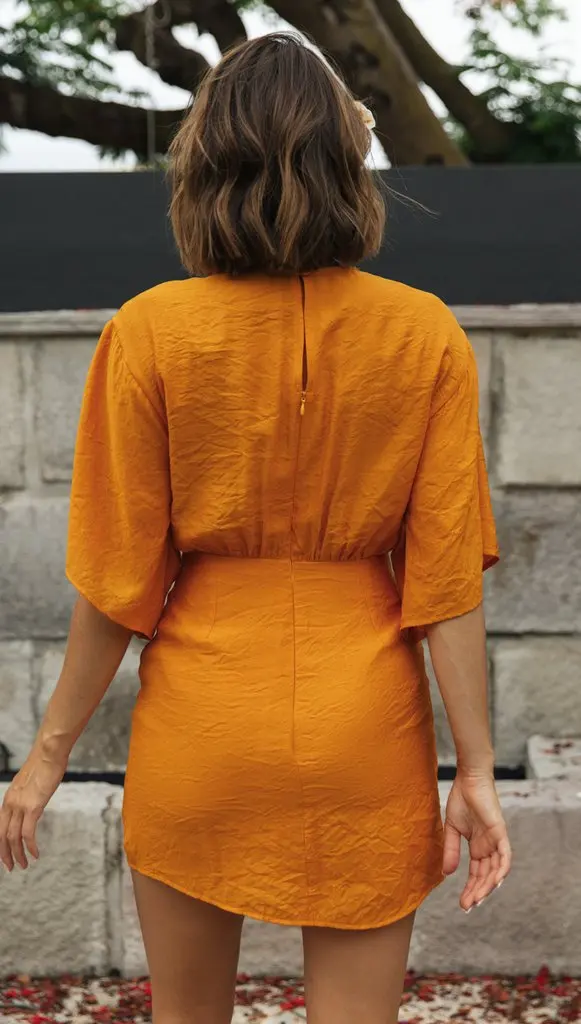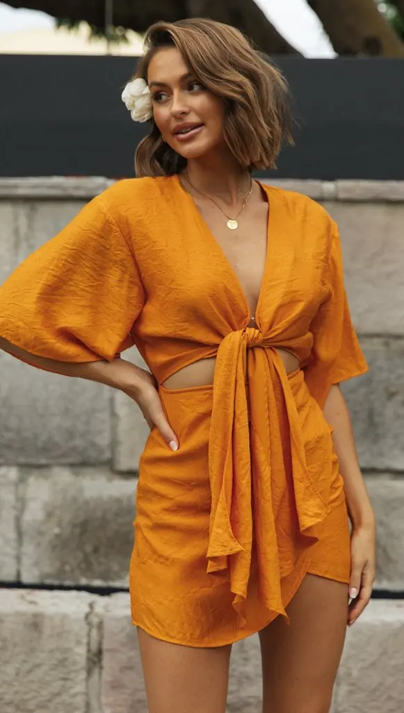 Sexy Hoollow Out Deep V Neck Women Dress Orange Lace Up Short Sleeve Irregular Loose Female Dress Casual 2022 Summer New