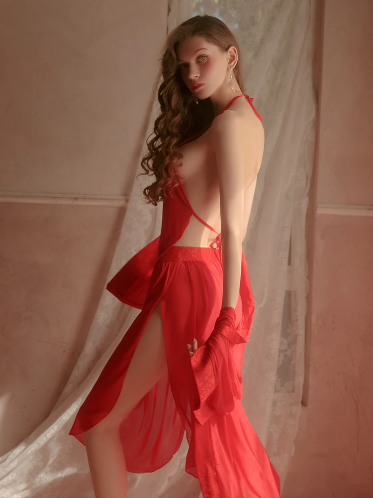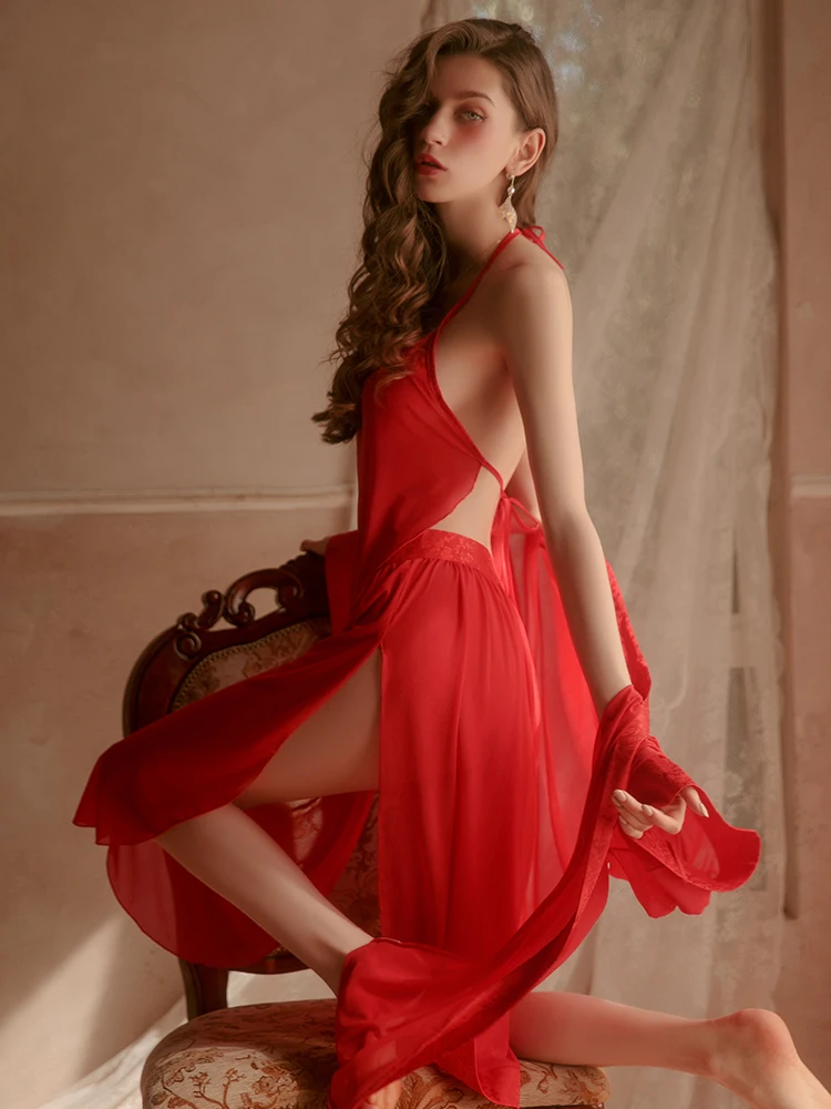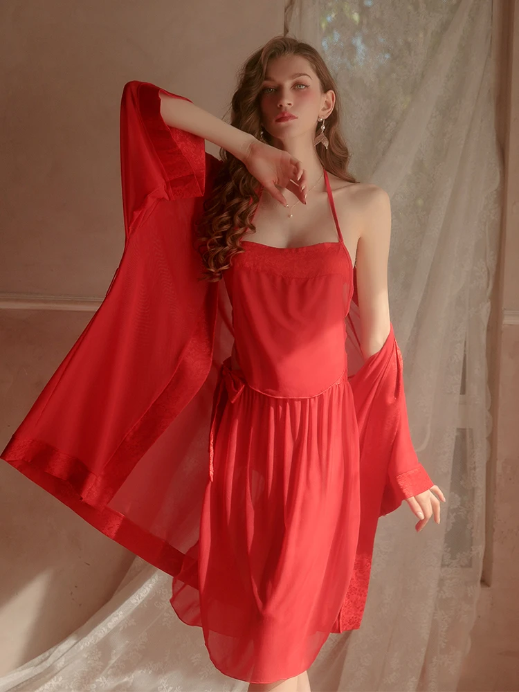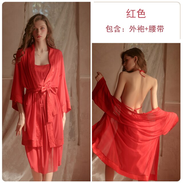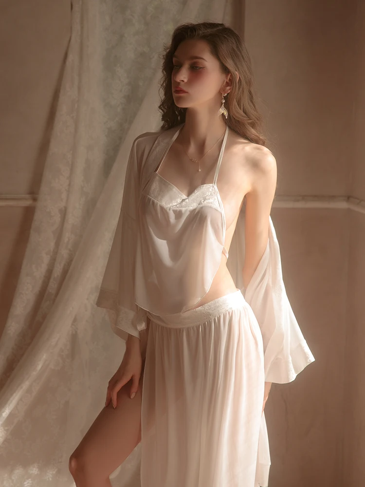 Sexy Lingerie Female Mesh Temptation Bellyband Lace HomeDress Perspective Bathrobe Three-Piece Bra Set And Robe