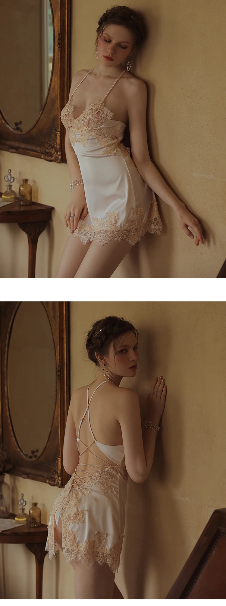 Sexy Pajamas Hot Lace Split Beauty Back Nightdress Dream Blue Luxury Suspenders Female Silky Dress with Panty Dressing Gowns