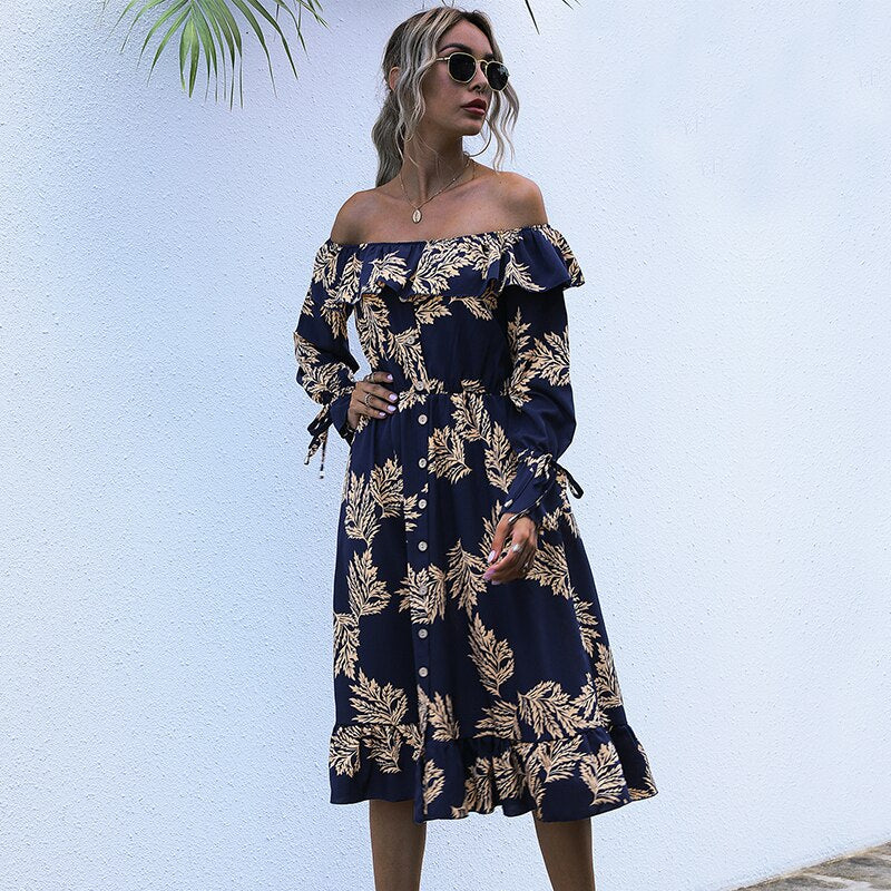 Sexy Slash Neck Print Dress Women Casual High Waist Ruffles Autumn Winter Button Off The Shoulder Dress For Women 2020 New
