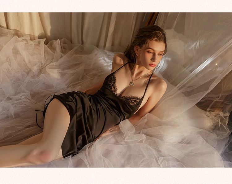 Silk Nightdress Lace Night Gown Sexy Lingerie Back Bandage See Through Nightgown Suspender Sleeping Dress Sleep Tops