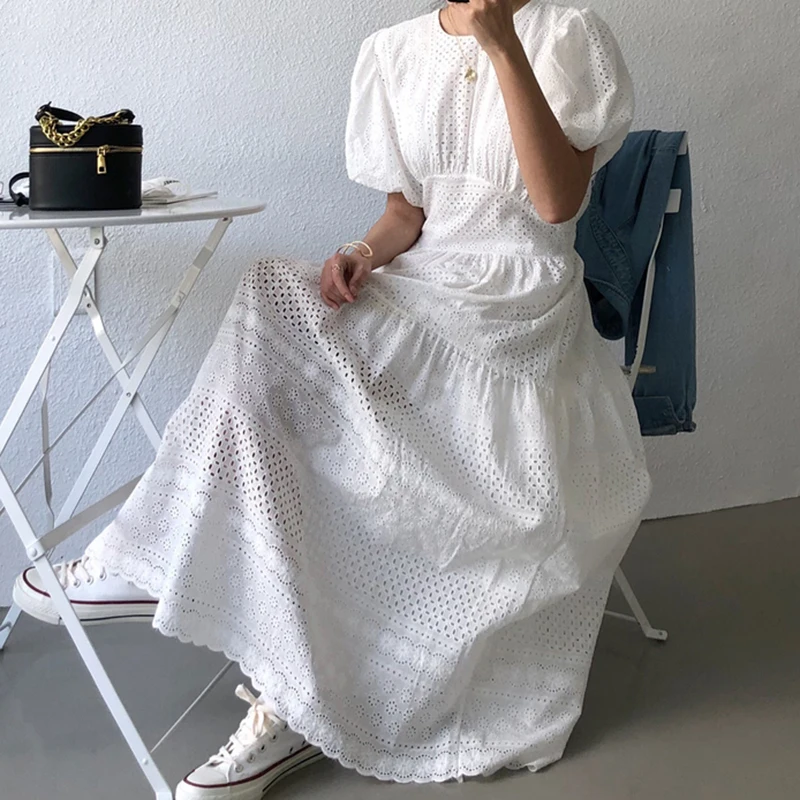 Elegant O Neck Puff Sleeve Lace Hollow Hook Flower Woman Dress Exquisite Feminino Slim Waist Robe A Line Korean Chic Vestidos