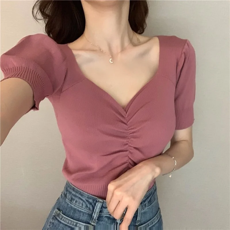 Summer 2021 New All Match Slim Female Tee Sexy V-neck Woman Knitted T-shirts Fashion Puff Short Sleeve Solid Knit Tops Woman
