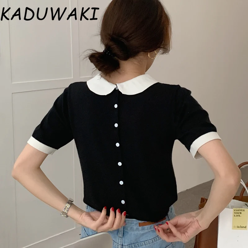 Korean Chic Summer Peter Pan Collar Women Tops Single-breasted Back Design Thin Elastic Pullovers Short Sleeve T-shirt Women