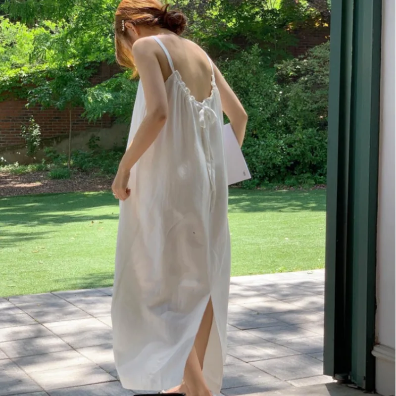 Summer Wide Loose Long Slit Beach Dress Female Cotton and Linen Soft Vestidos Sleeveless Design Back Hollow Out Robe Femme
