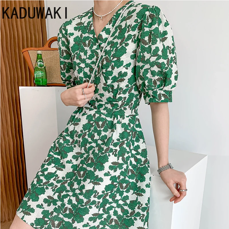 Retro Floral V-neck Puff Sleeve Dress Women Short Sleeve Simple Temperament A-line Loose Vestidos Elegant Office Lady Dress