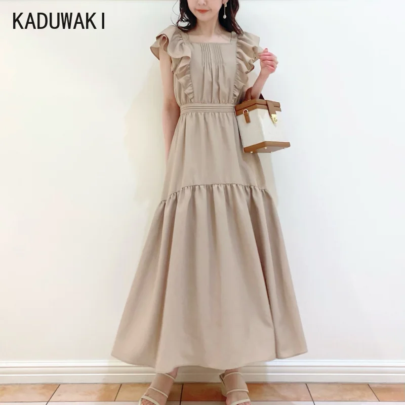 Sweet Ruffles Flying Sleeve Square Collar Woman Dresses Solid Elegant Summer New Trendy Dress Japan Style Office Ladies Robe