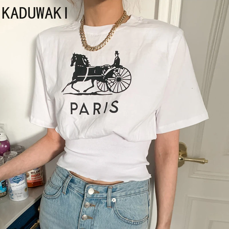 Korean Chic Summer T-shirts O Neck Letter Cartoon Printing Slim Waist Short-sleeved T-shirt Women Simple Fashion Graphic Tee