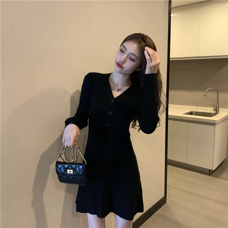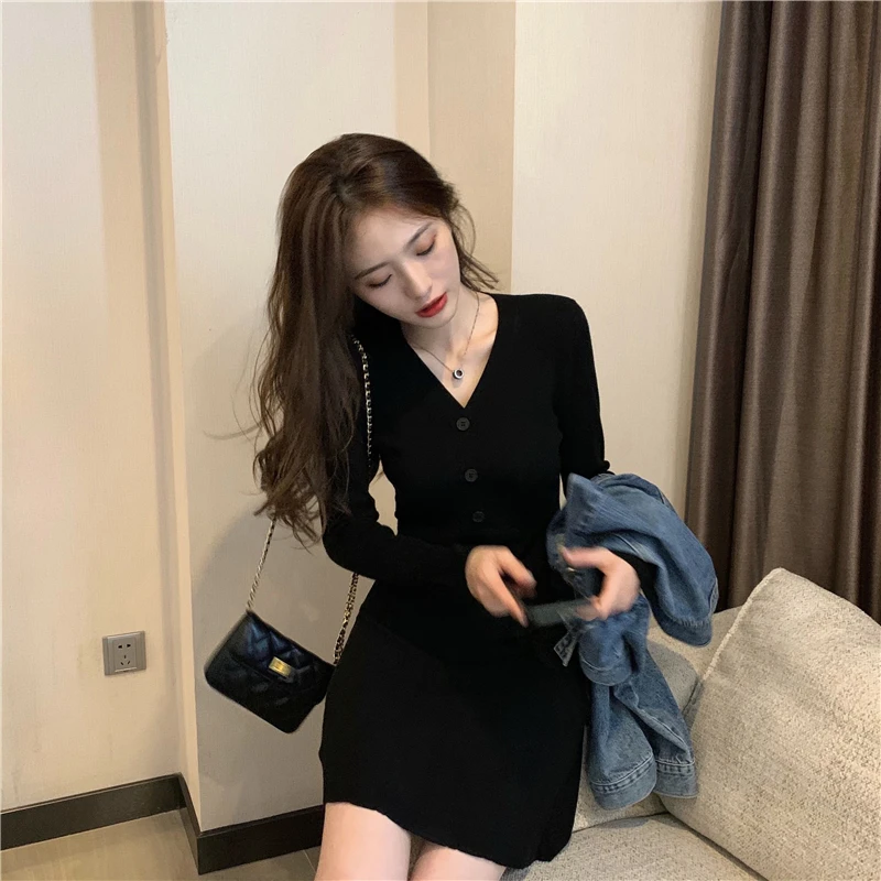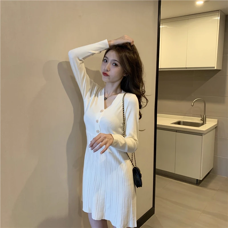 Simple V Neck Long Sleeve Knitted Dress Women Korean Style Chic Slim Fit Elegant All Match Robe Autumn Winter Bottom Vestidos