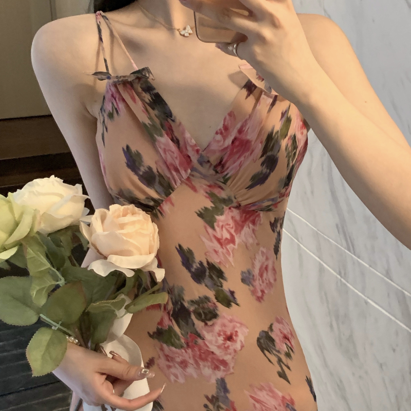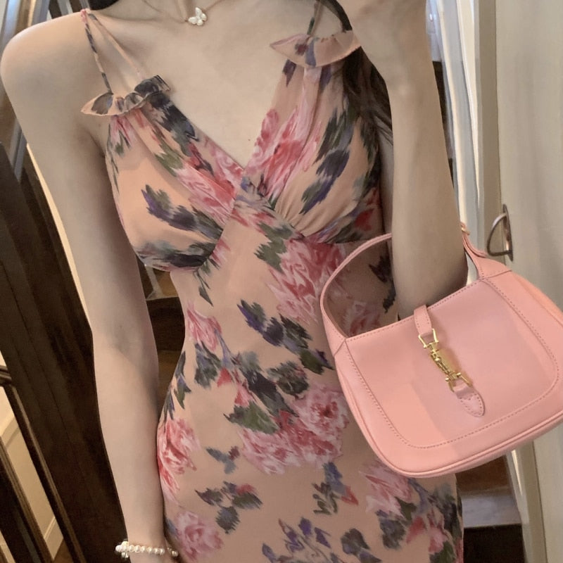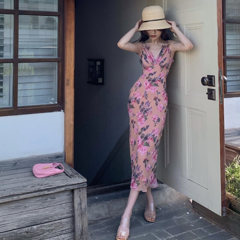 Summer Sexy Strap Dress Women Korean Backless Beach V-Neck Elegant Floral Dress Casual Bodycon Holiday Party Midi Dress 2021