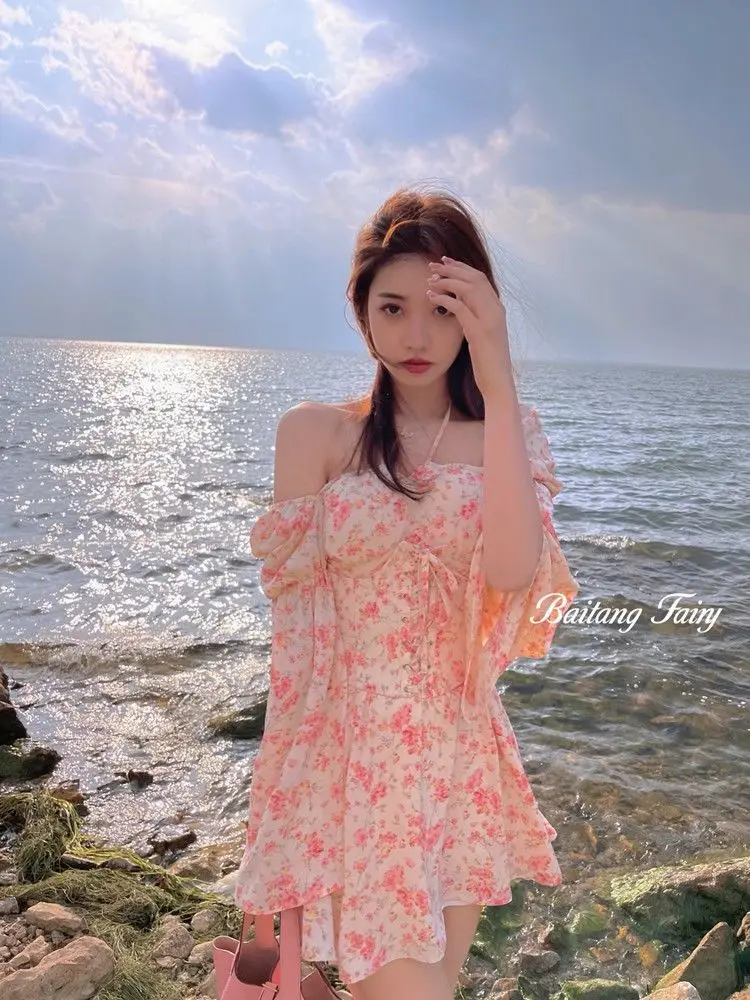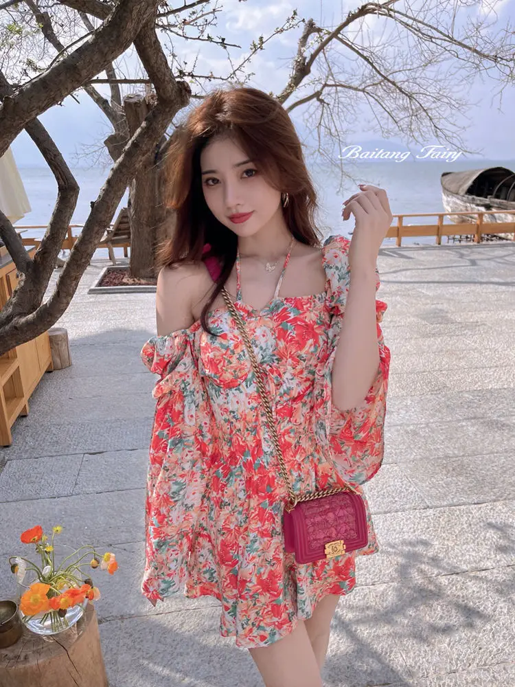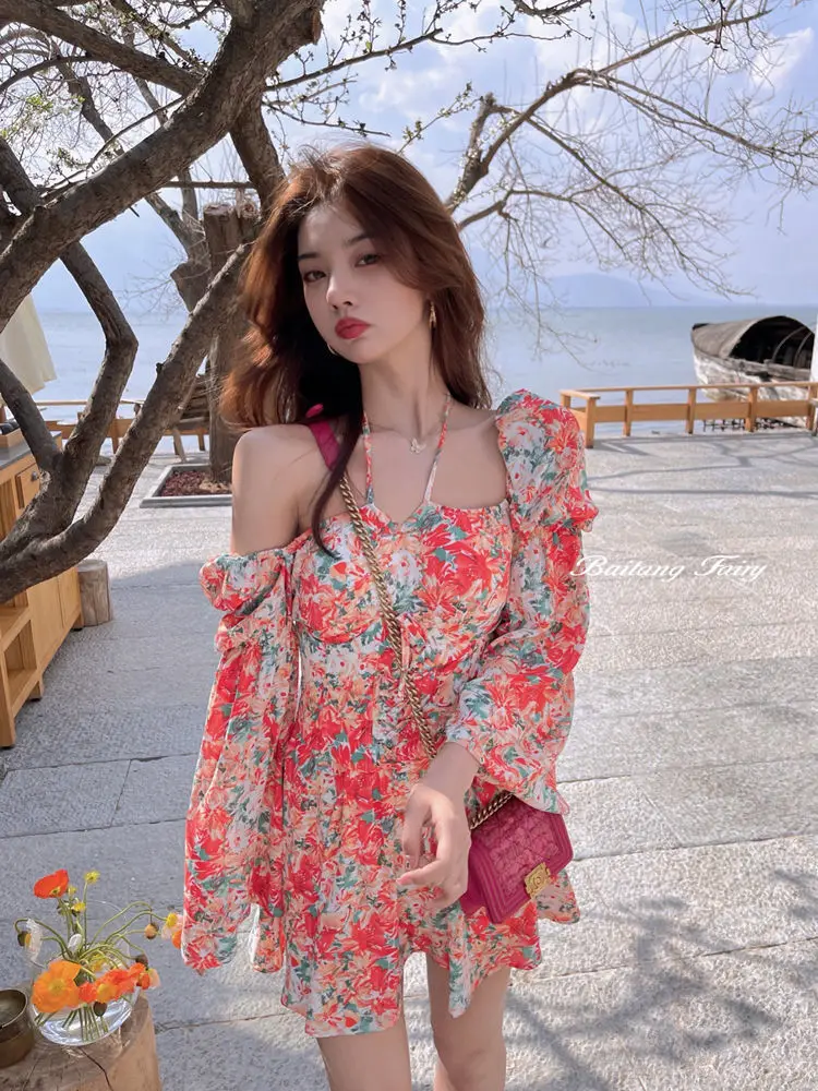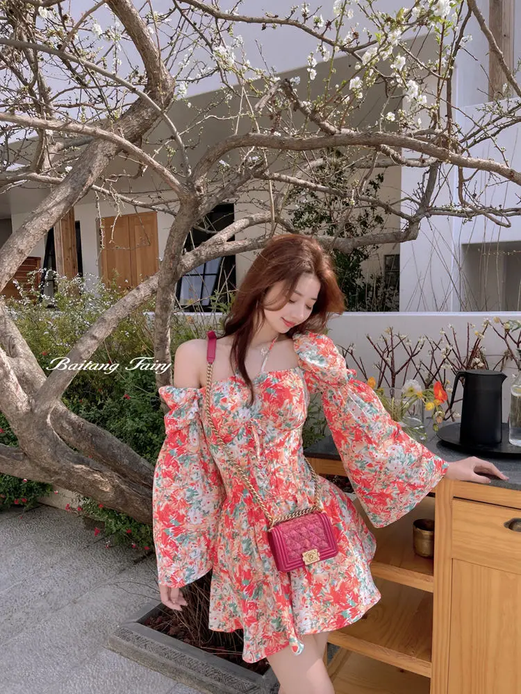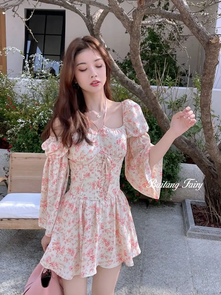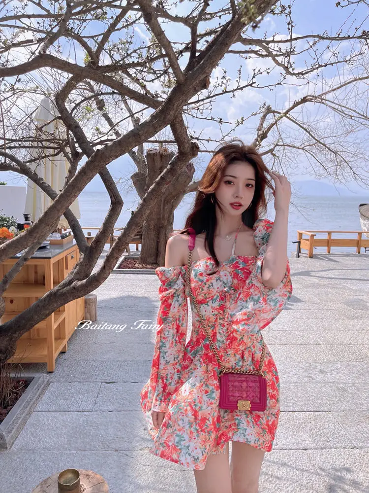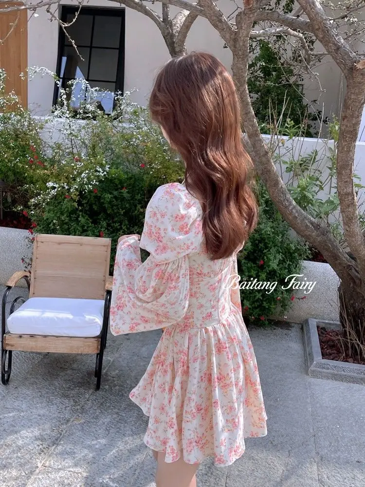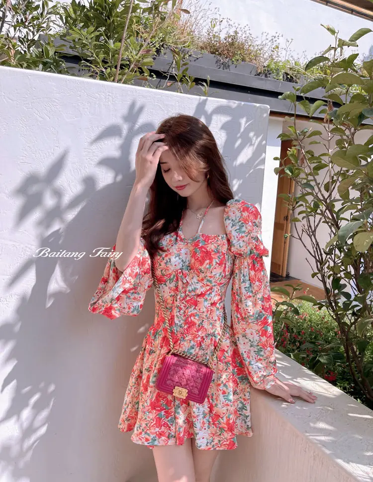 Sweet Floral Dress Women Elegant Chic Sexy Designer Party Mini Dress Female Casual Outdoor Beach Print Kawaii Dress Summer 2021