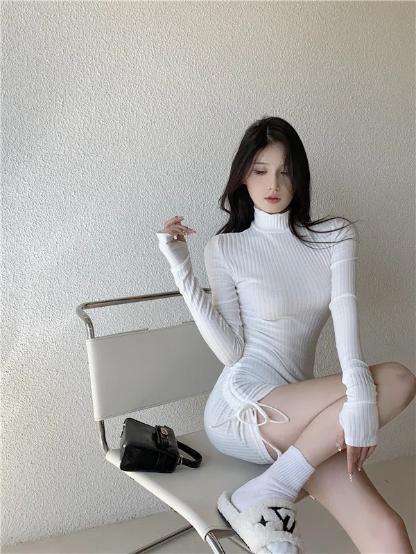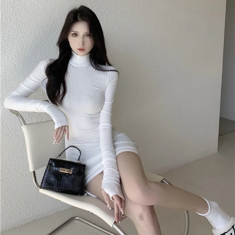 Winter Turtleneck Knitted Sweater Dress Women Sexy White Bodycon Party Mini Dress Female Elegant Korean Designer Y2K Dress 2021