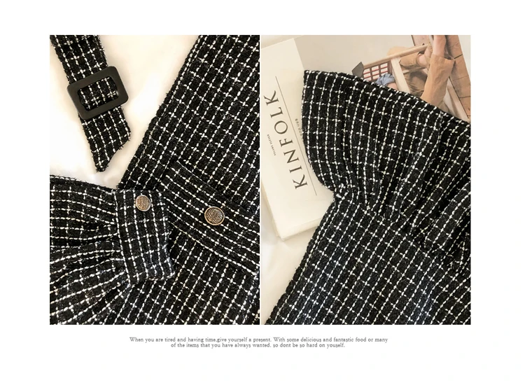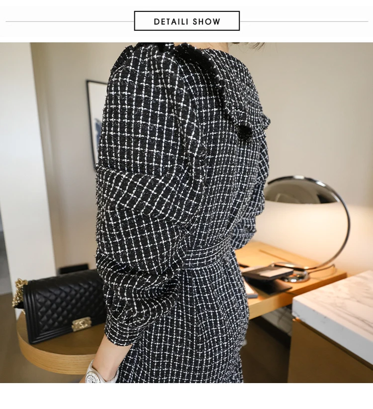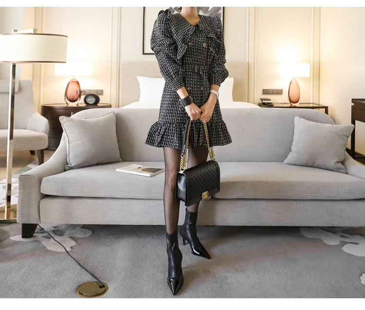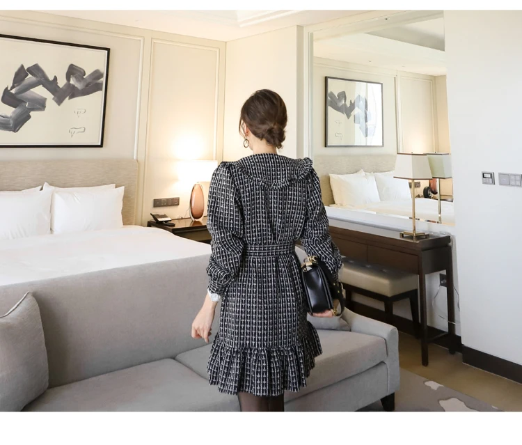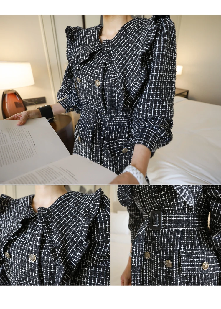 Women 2020 Winter New Korean Style Temperament Double-Breasted Sashes Ruffled Bodycon Dress Long Sleeve Plaid Dress Female