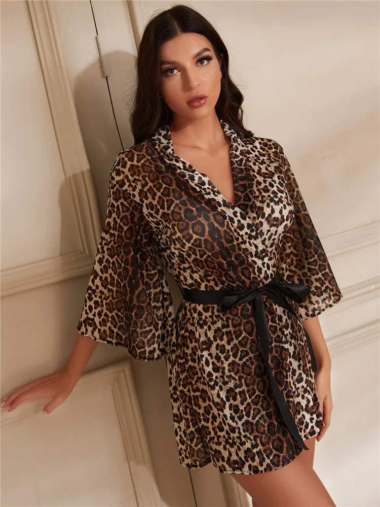 Women's Bathrobe Leopard Print Belted Mesh Sleep Robe Bride Bridesmain Panty Dressing Gown