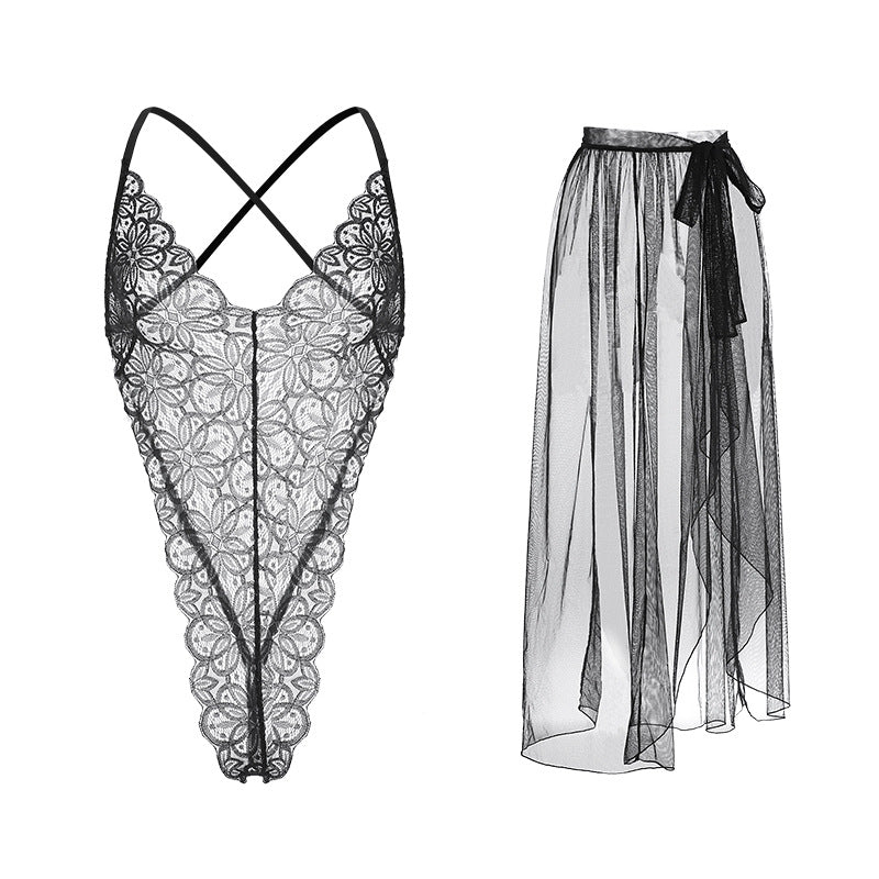 Women's sexy lingerie erotic mesh perspective hot jumpsuit lace-up veil nightdress femme slutty skirt adult clothes see though