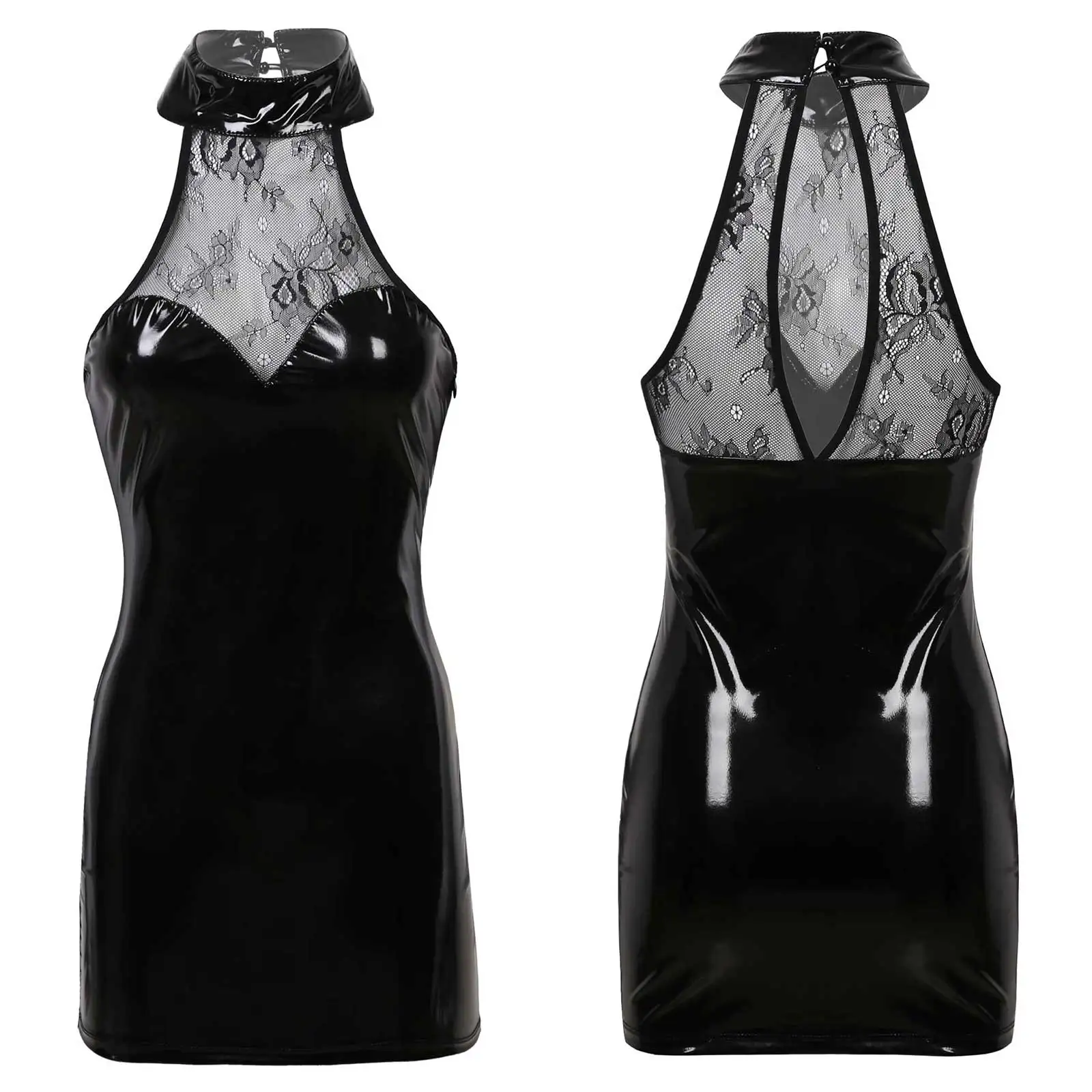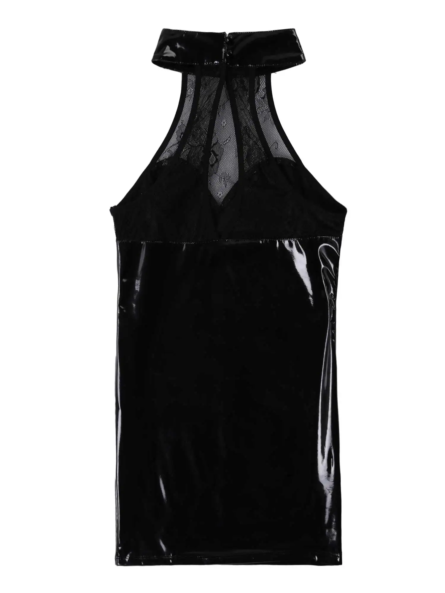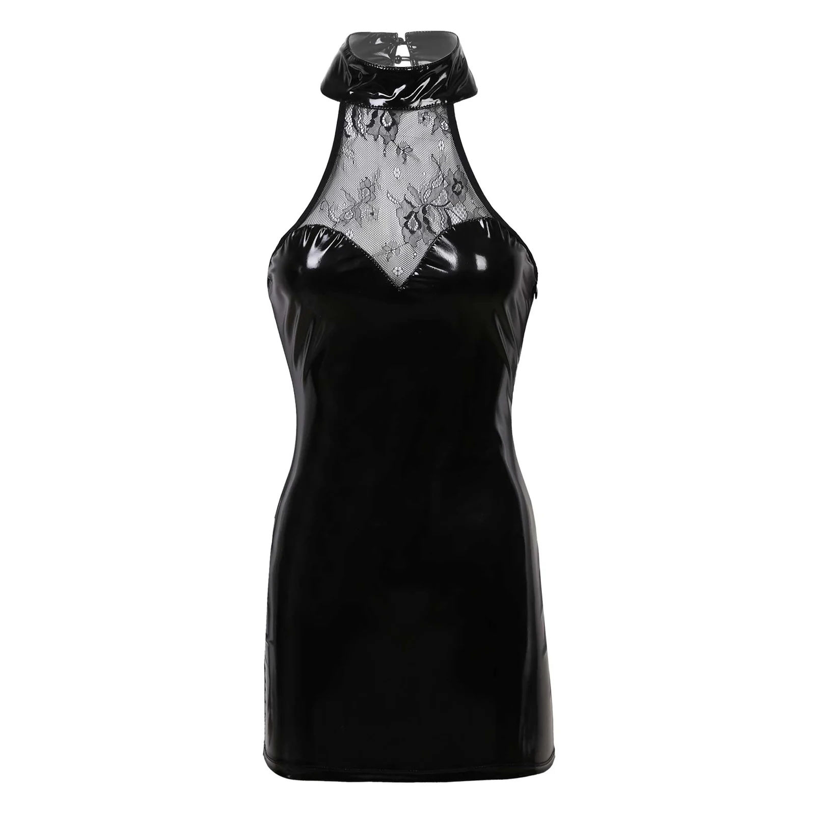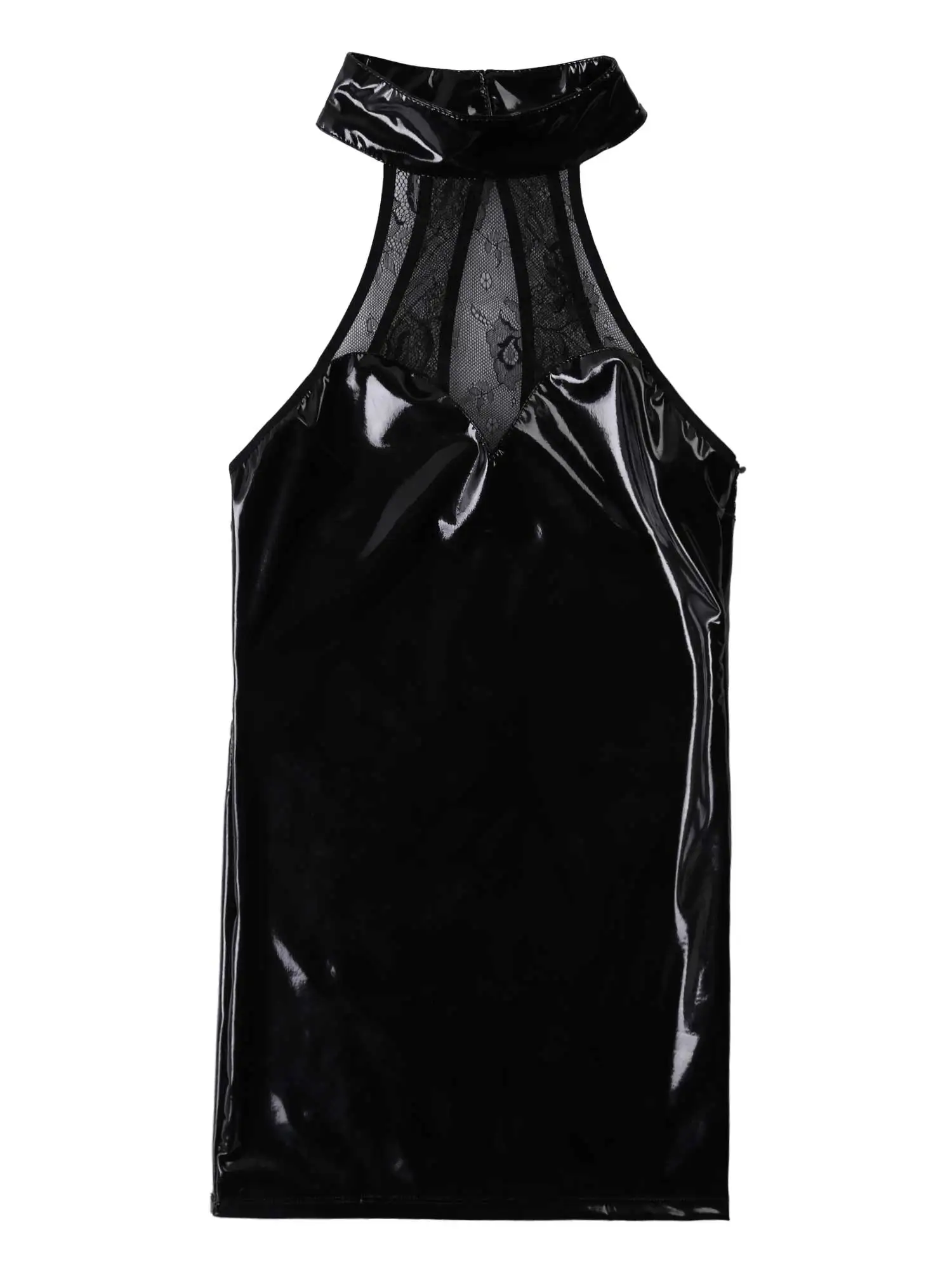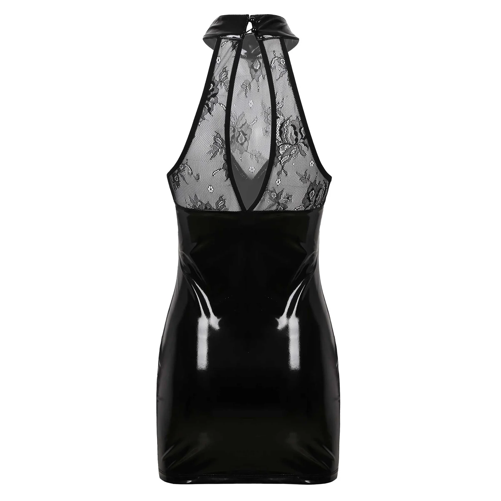 Women Fashion Clubwear Wetlook Patent Leather Front Hollow Out Lace up Latex Bodycon Mini Dress for Cocktail Party Night