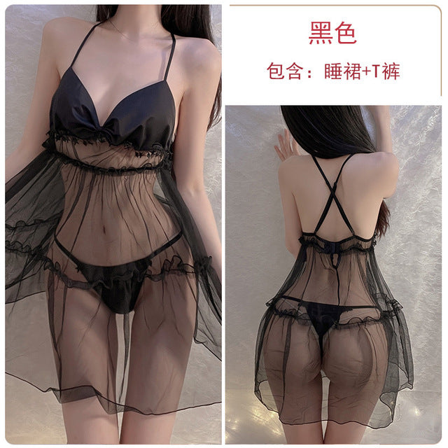 Women Sexy Lingerie Exotic Nightdress Satin Net Dress Set See-through Backless Lovely Girl Skirt Thong Suit Erotic Underwear