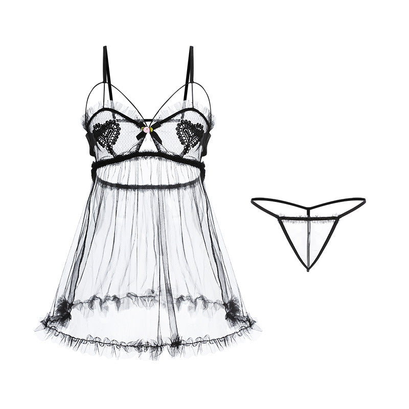 Women Sexy Nightdress Slutty Lingerie Set Mesh See-through Backless Skirt Femme Erotic Porno Dress G-string Love Embroidery