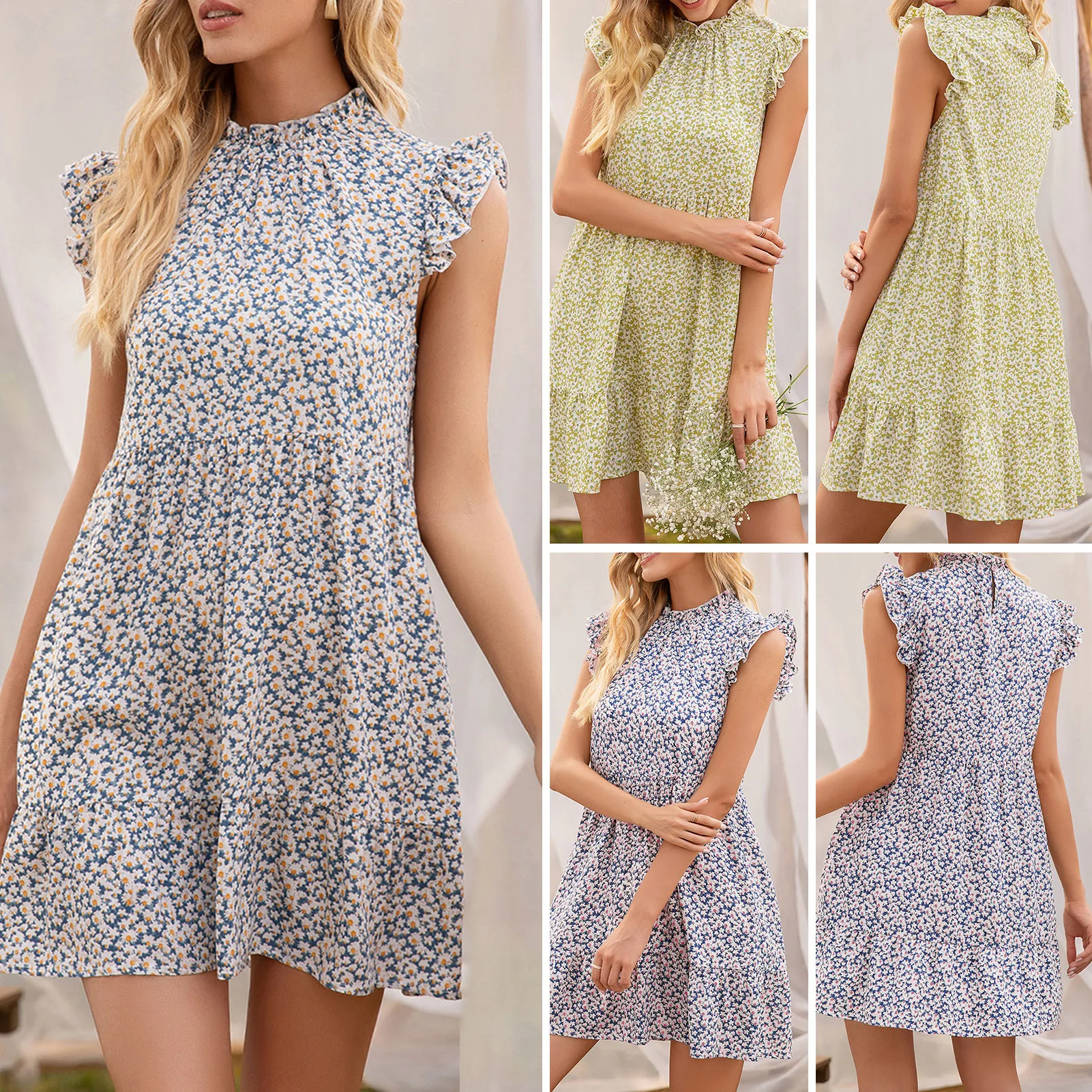 This summer mini dress features ruffle sleeves, an elegant stand collar, and cute floral printing. Loose fit and flowy ruffle hem give you cool and free feelings on summer days. Put it on to enjoy a relaxing and stylish time.