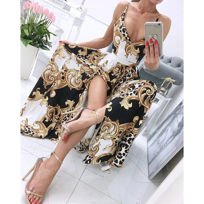 Women's leopard print V-neck sexy long dress for night party fashion slim dress