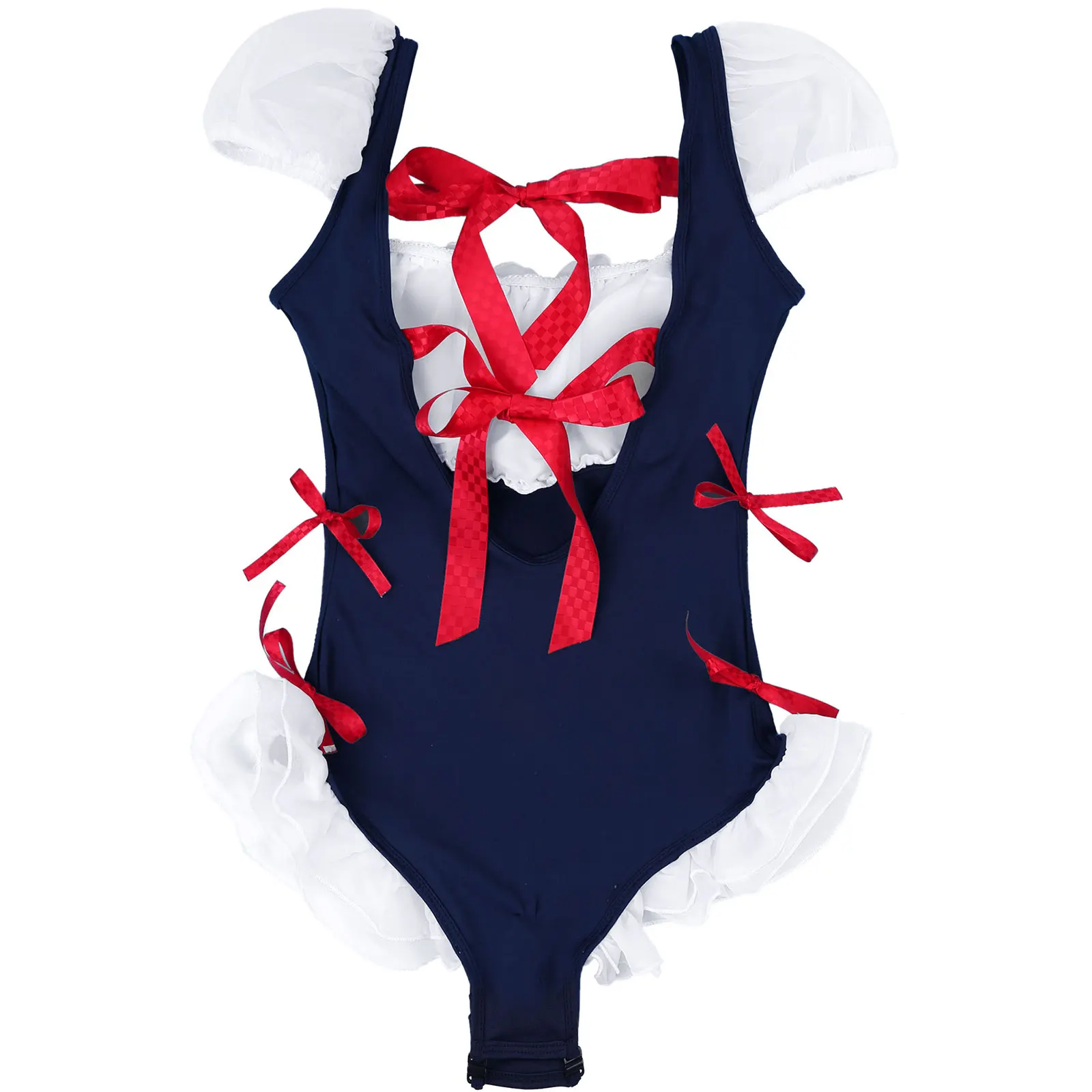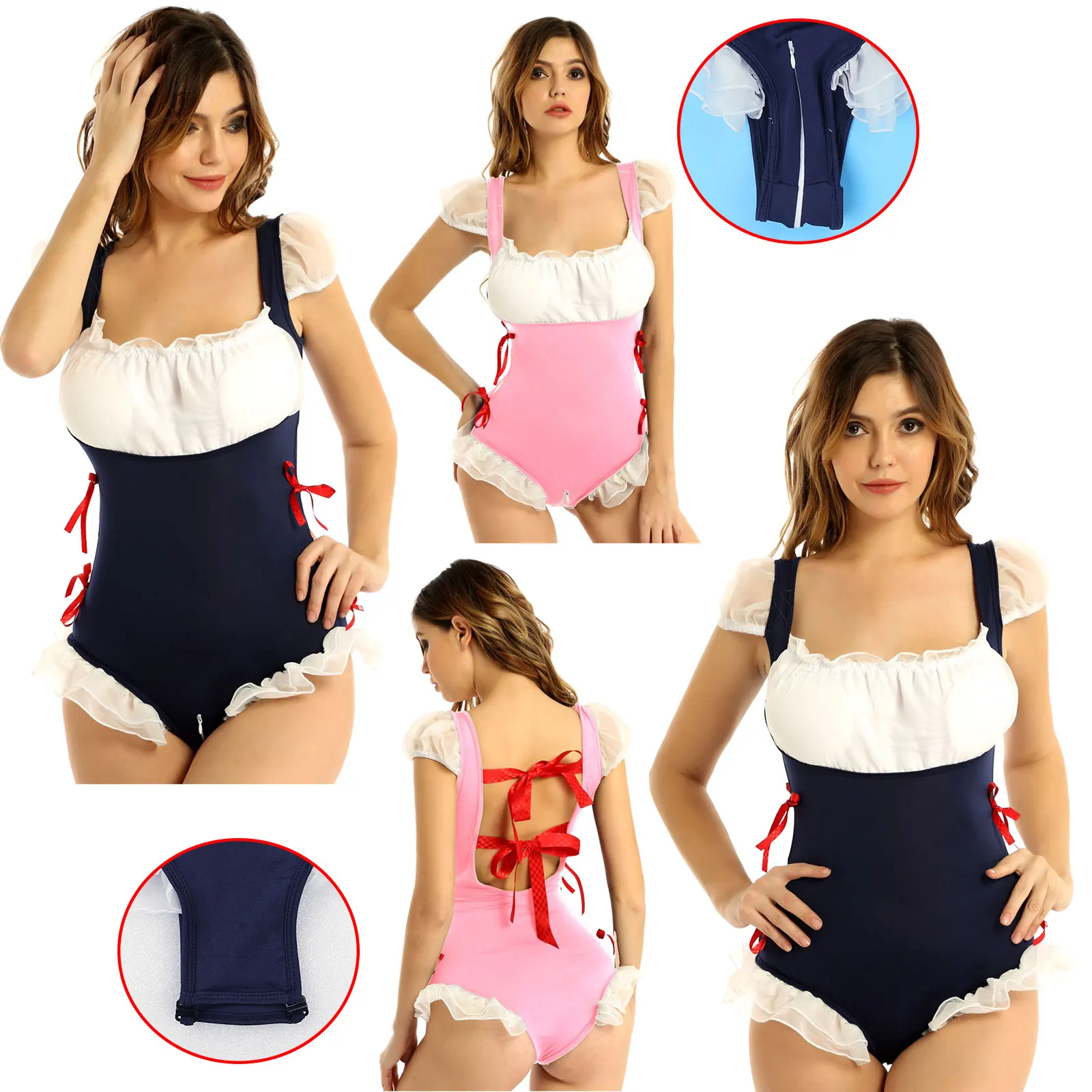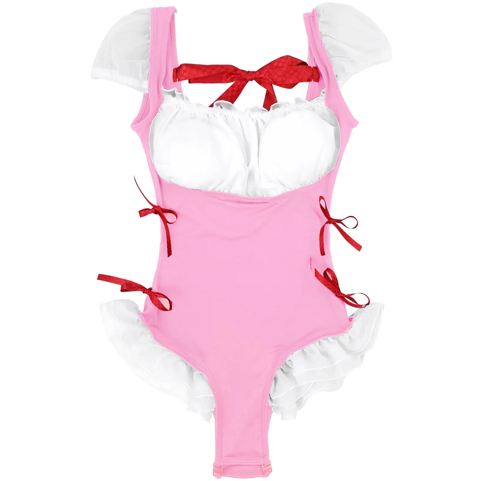 Women Bowknot Ruffle Maid Cosplay Costume Role Play Fancy Dress Ball Puff Sleeve Pleated Bodysuit.