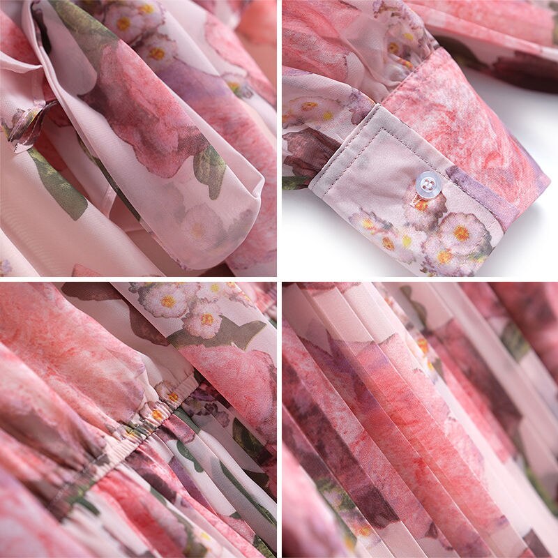 Women's Summer Pleated Chiffon Silk Waist Long-Sleeved Floral Streamer V-Neck Dress Romantic French