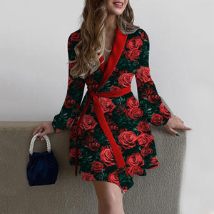 Casual Women's Homewear Fashion Rose Flower Print Pajamas Lapel Long Sleeve Dress Nightgown Lightweight Short Fluffy Bathrobe  - Regular price