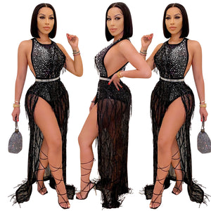 New fashion clubs hot diamond mesh mesh sexy fringed women two-piece dress