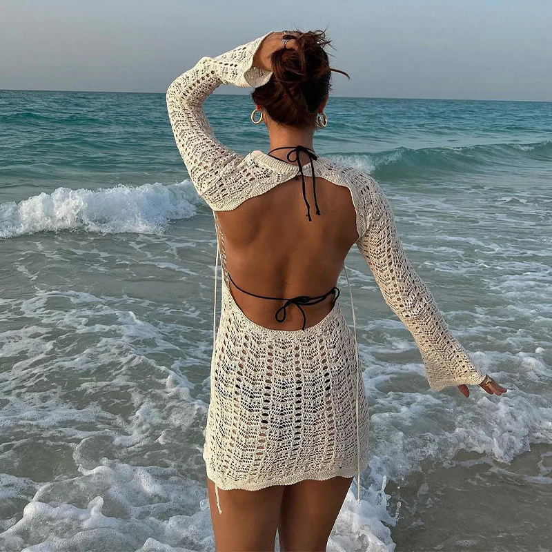 2022 Fashion Flare Long Sleeve Sexy Backless Bandage Mesh Perspective Mini Dress Outfits Women Summer Beach Dresses