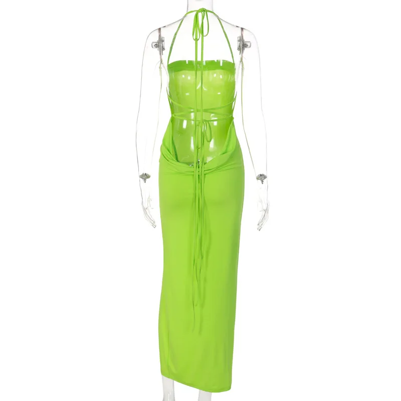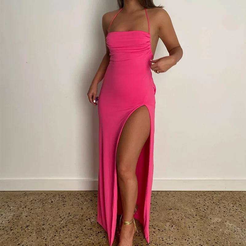2022 Ruched Split Maxi Dress for Women Sexy Bandage Backless Summer Halter Beach Long Dresses Gown Club Party Clothes