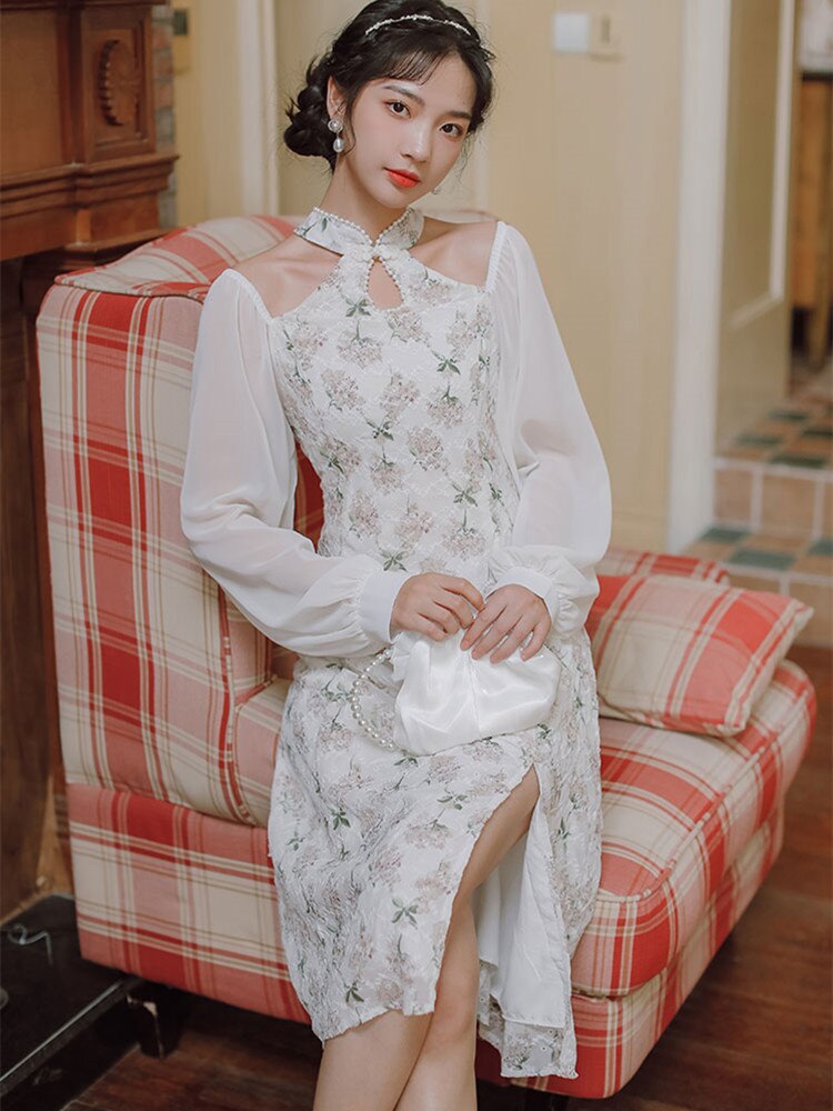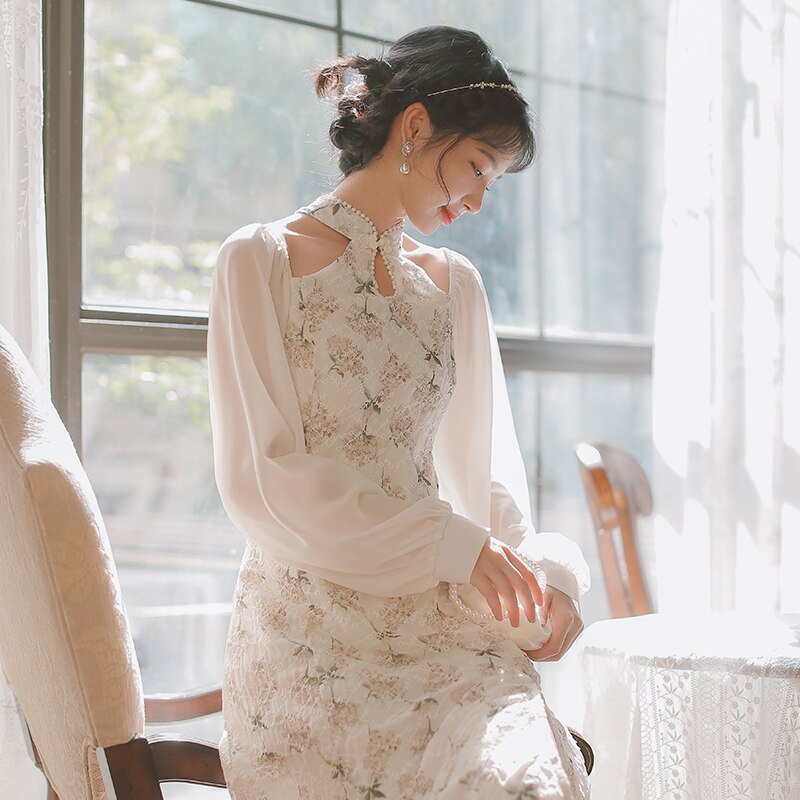 Cheongsam Retro Elegant Dresses for women Fall Beaded Chic Hollow Sexy Halter Neck Stand Collar Fit Floral Dress Fashion Femme