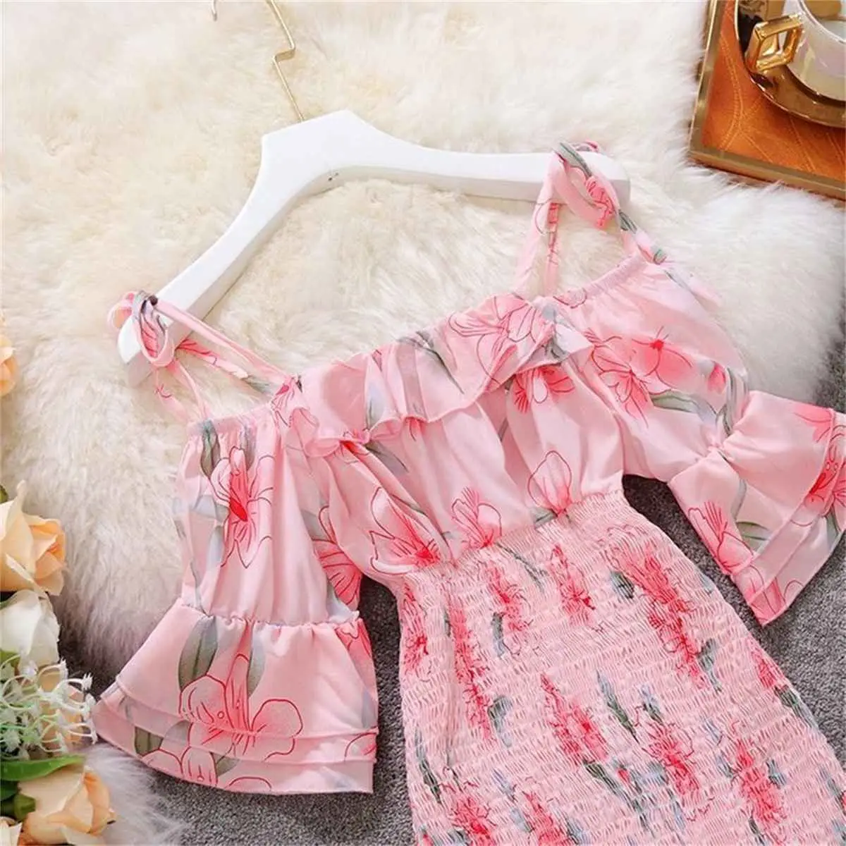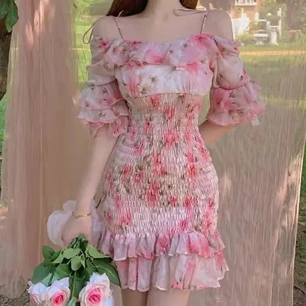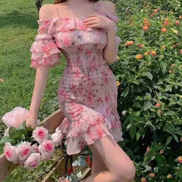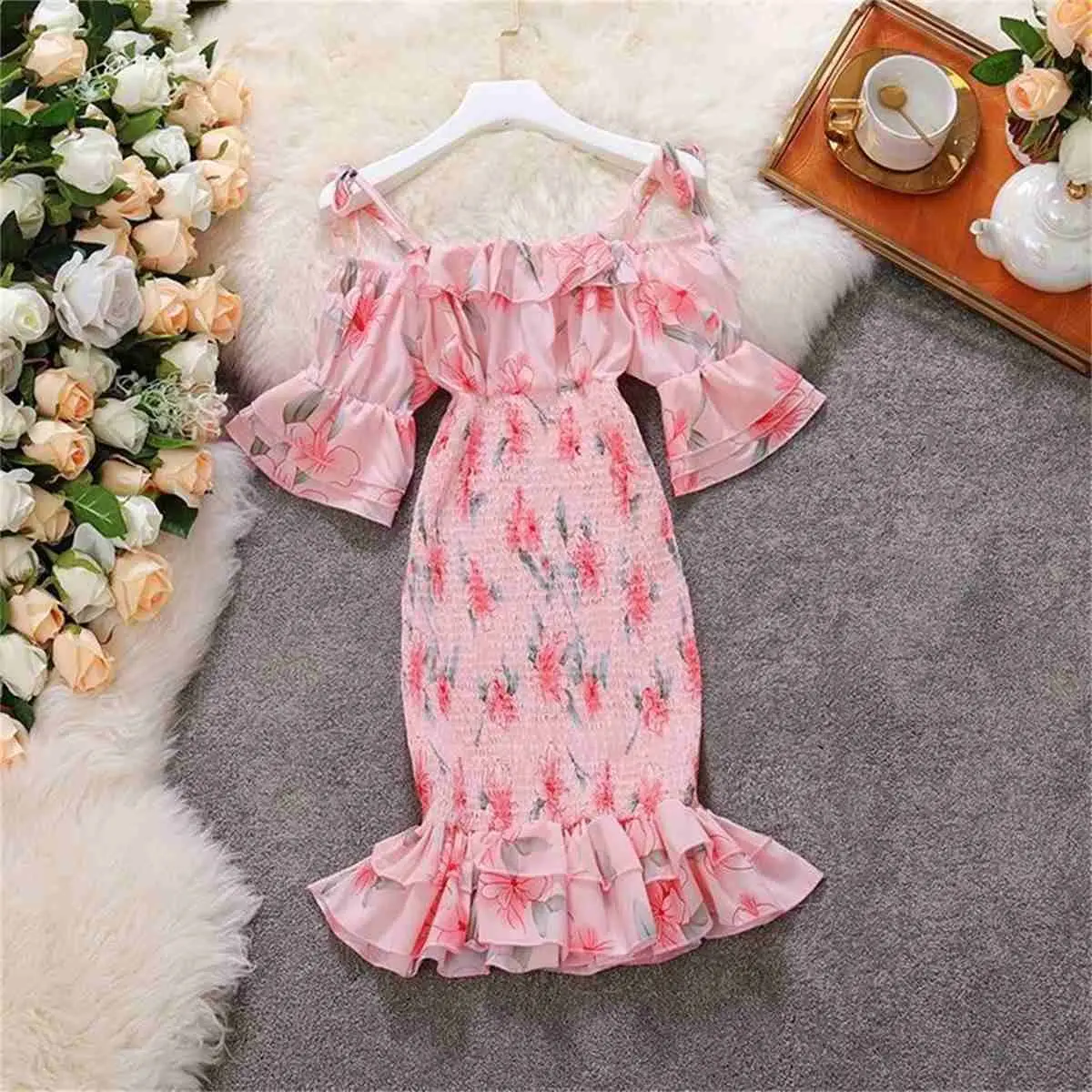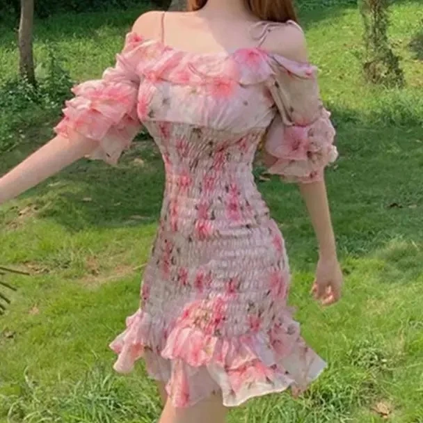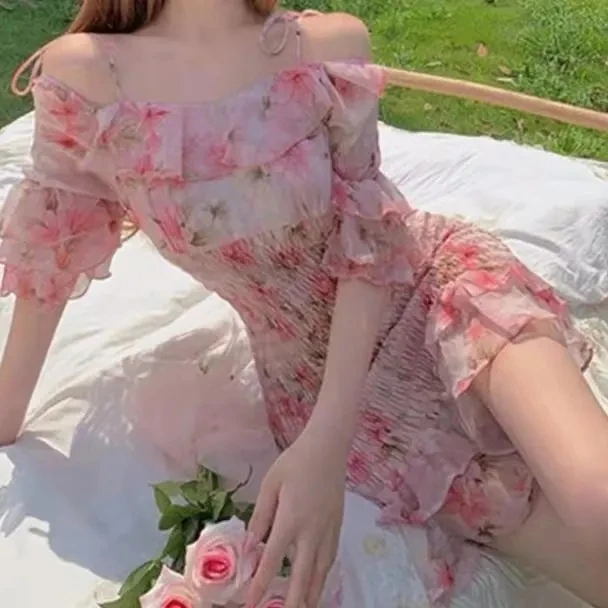 Dresses For Women 2022 Flounced edge floral frilly dress korean fashion Slash neck Women's summer sundresses vetement femme