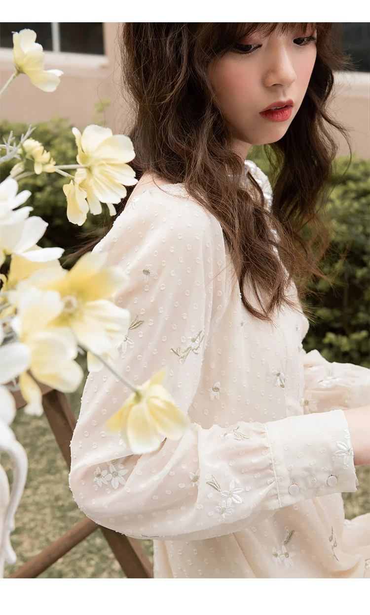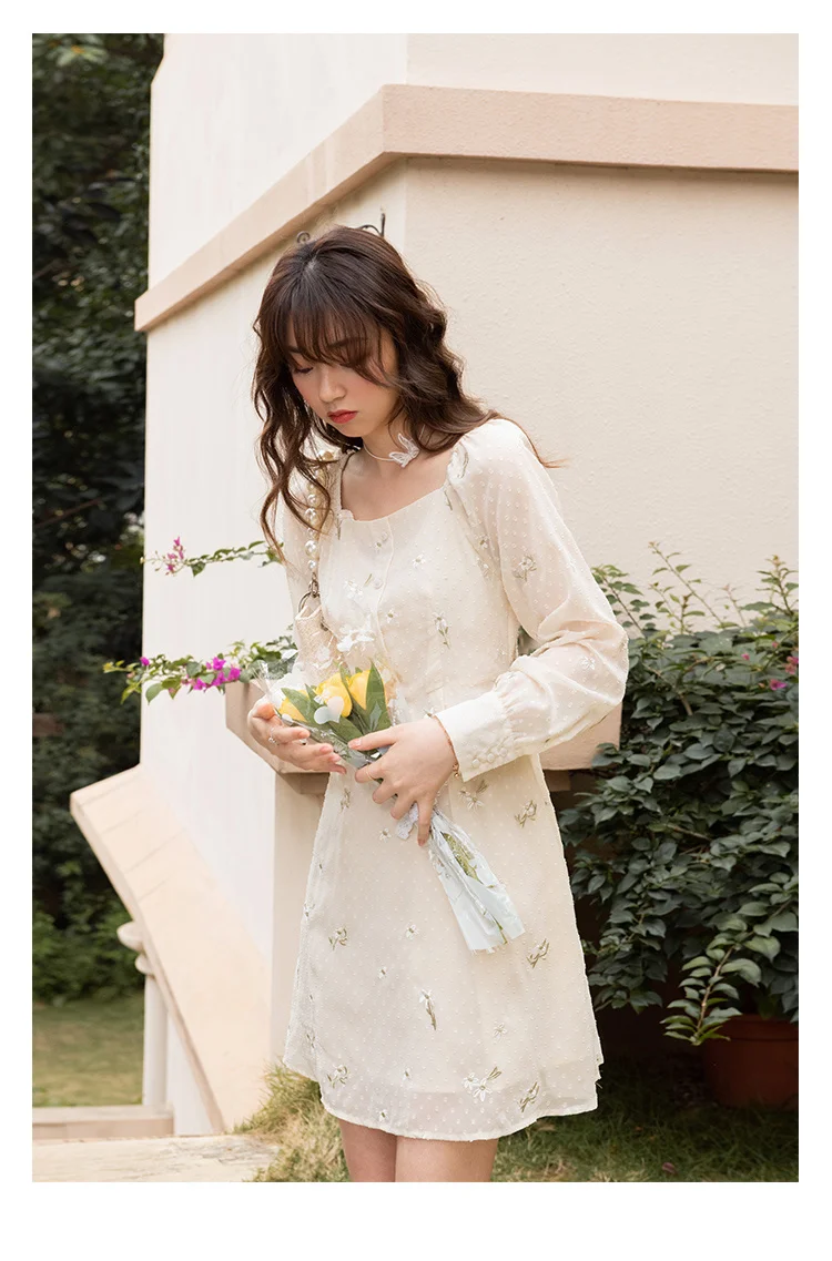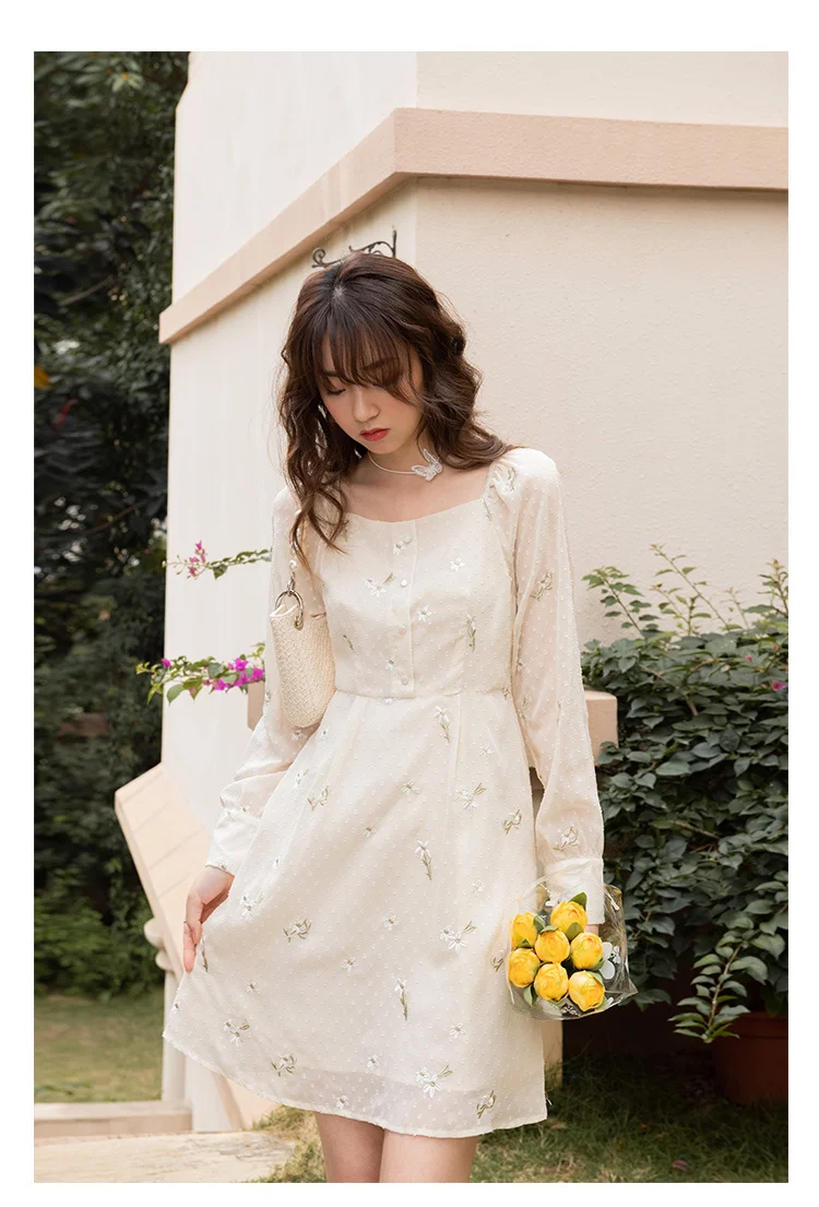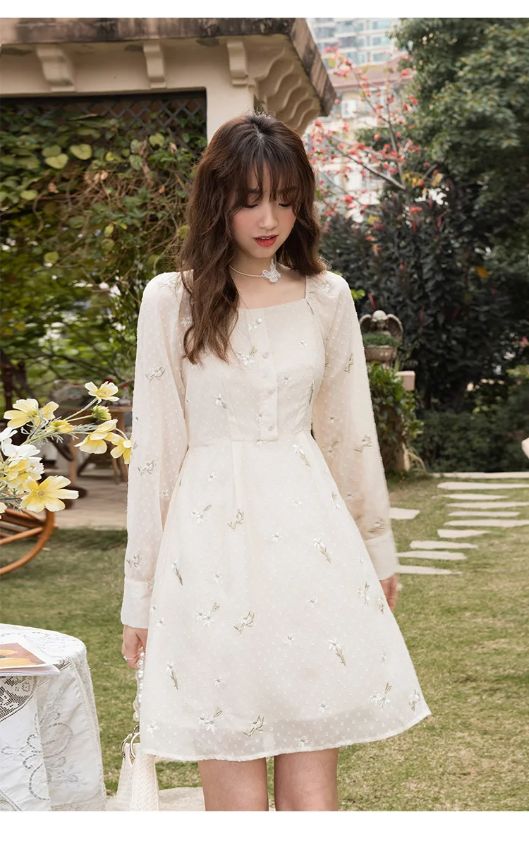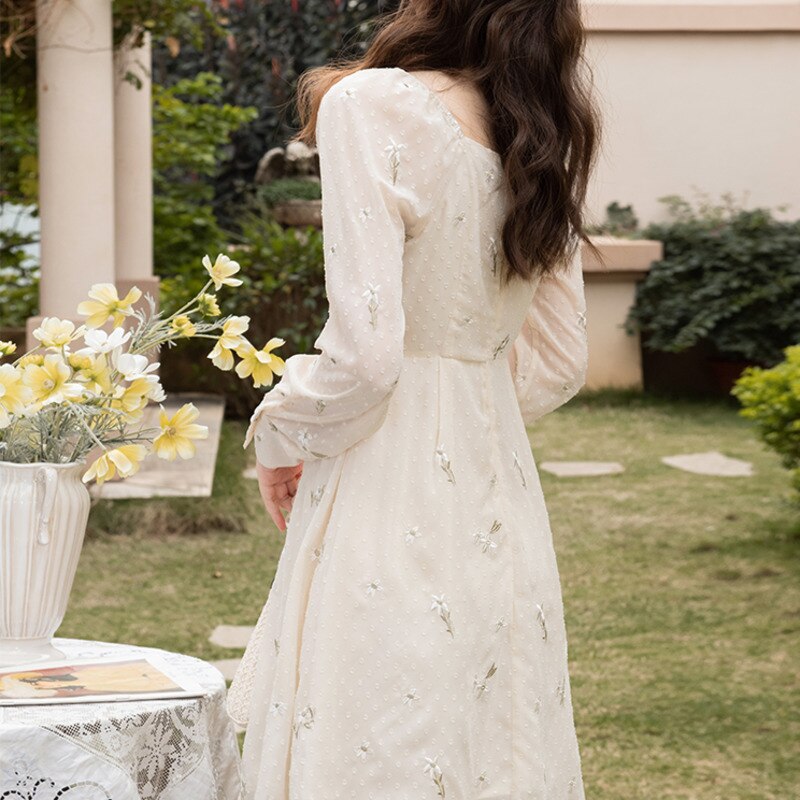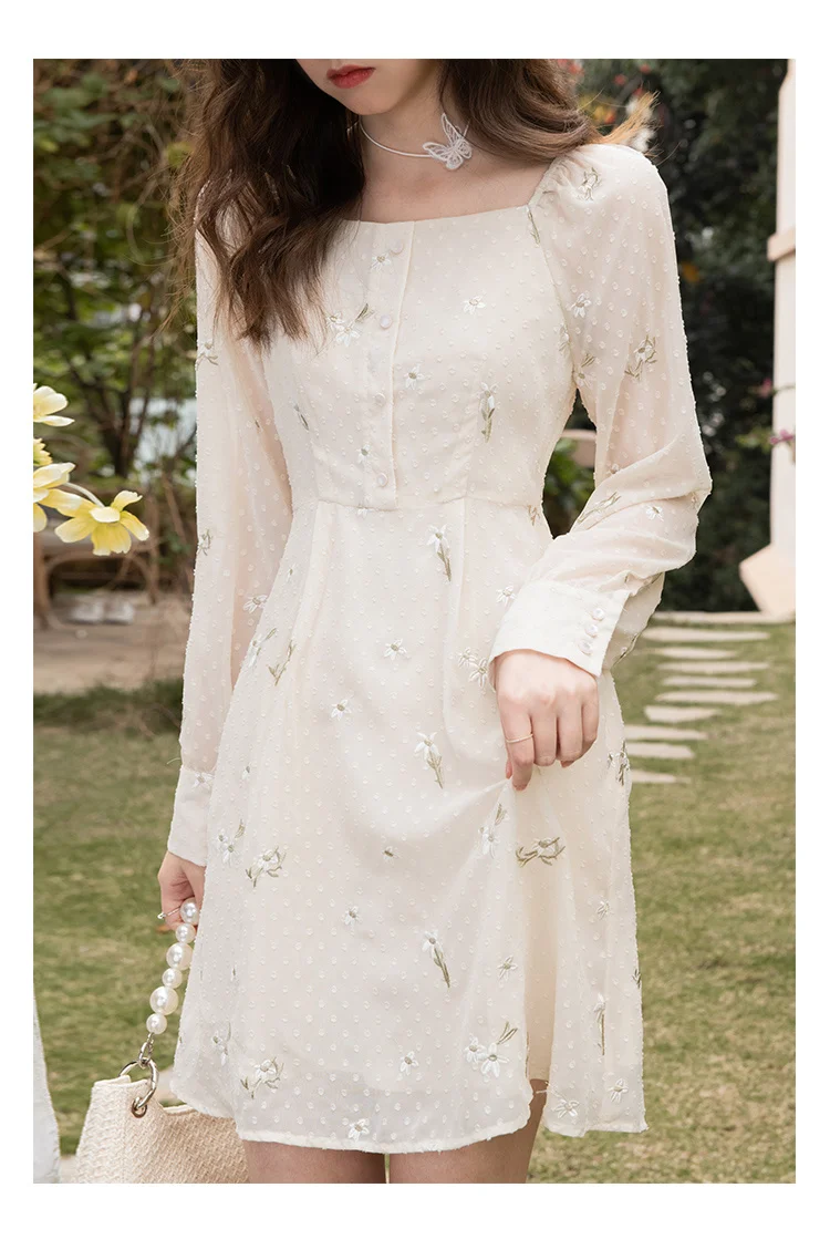 Dresses For Women Long Sleeve Print Embroidery Fashion Party Robe Square Neck Sweet High Waist Single Breasted Vestido De Mujer