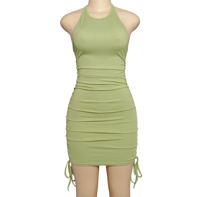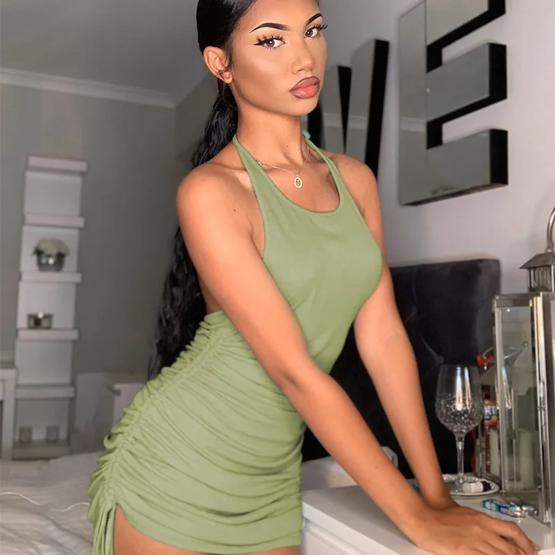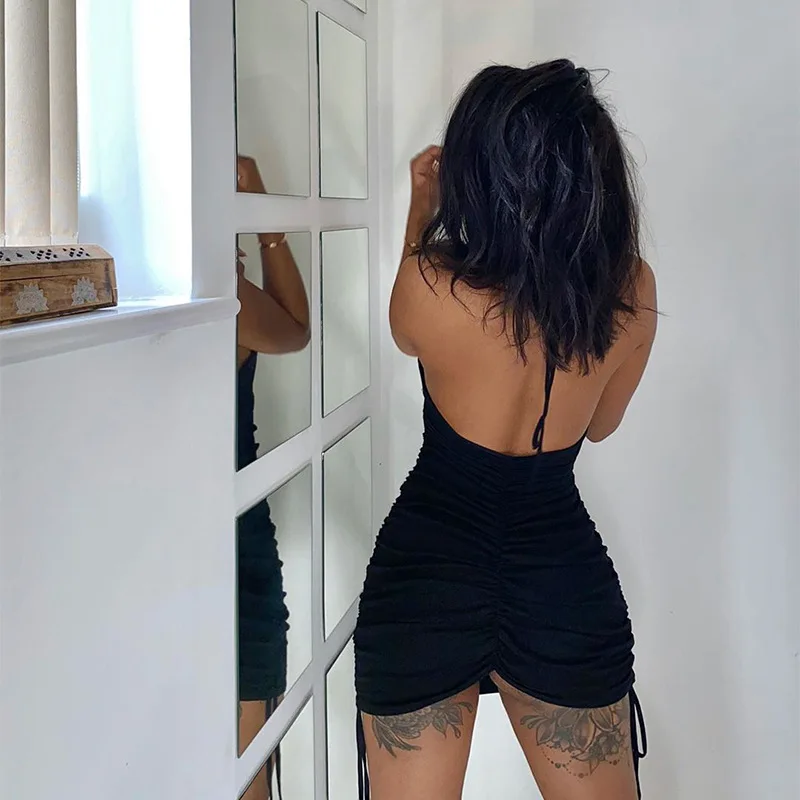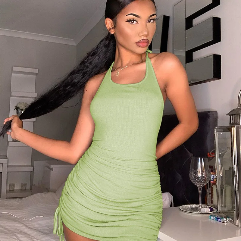 Elegant Halter Neck Knitted Drawstring Bandage Bodycon Dress Women Summer 2021 Fashion Casual Party Short Mini Backless Dresses