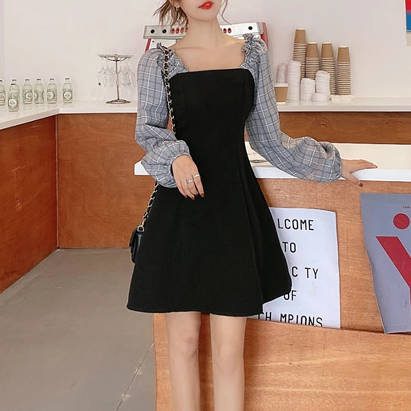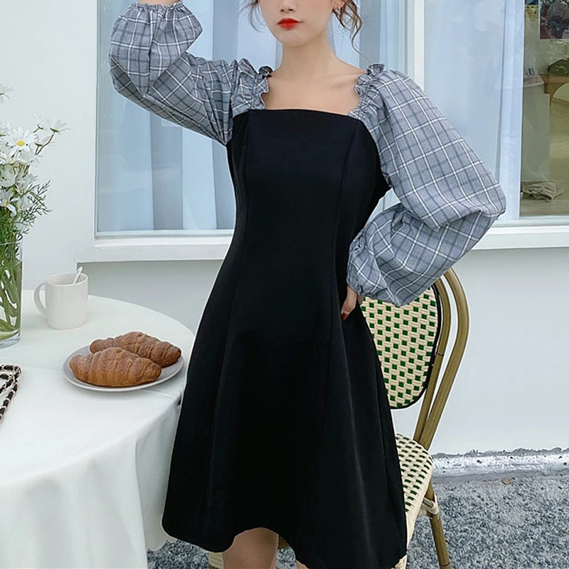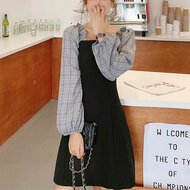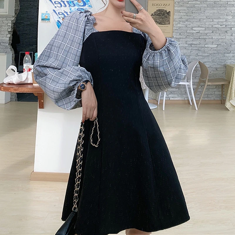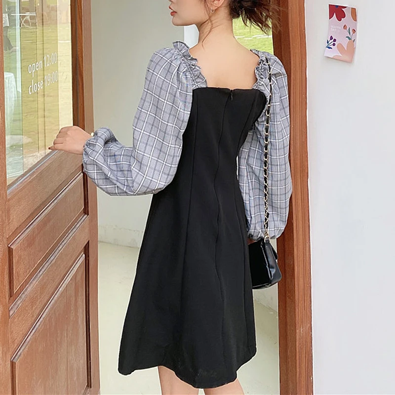 French Temperament Dress Women Square Neck Sweet Splicing Retro Plaid Little Black Dresses Female Autumn Slim Long-Sleeve Dress